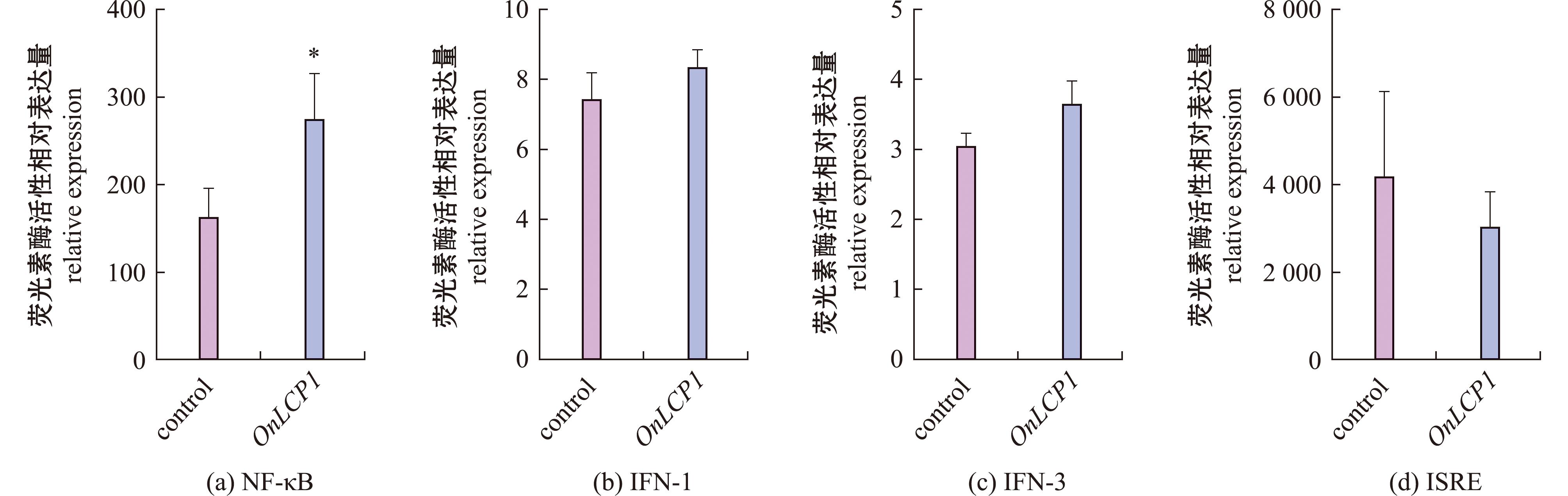 为验证该基因的功能,采用双荧光素酶报告系统检测了过表达OnLCP1对NF-κB、STAT1、ISRE、IFN-1和IFN-3等信号通路活性的影响。结果显示(图10),过表达OnLCP1后,NF-κB信号通路的荧光值显著升高(P<0.05),表明OnLCP1具有显著上调NF-κB信号通路的活性。
