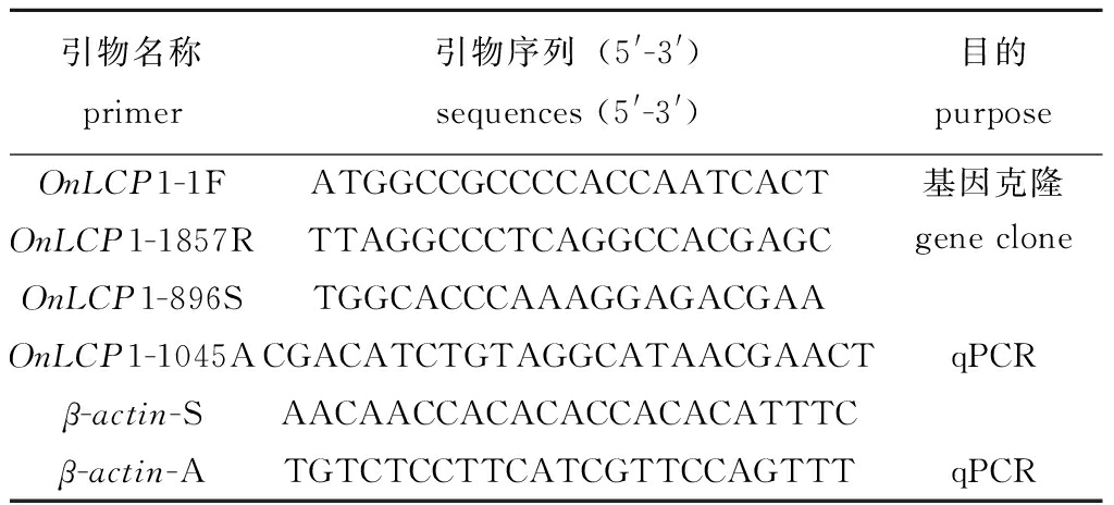 1.2.2 OnLCP1基因克隆 为了扩增LCP1基因的编码序列(CDS),本研究中利用Primer Premier 5.0软件设计了两对引物:OnLCP1-1F和OnLCP1-1857R(表1)。随后,采用PCR技术对目的基因进行扩增。PCR反应条件为94 ℃下预变性5 min;94 ℃下循环变性30 s,50 ℃下退火复性30 s,72 ℃下延伸1 min 50 s,共进行33 个循环;最后于 72 ℃下延伸 10 min;在 4 ℃下保存。PCR反应完成后,通过琼脂糖凝胶电泳对产物进行分析。目标条带经过琼脂糖凝胶回收后,与pMD18-T载体连接,并转化到E.coli DH5α感受态细胞中。转化后的细胞经过培养,挑选出单个菌落进行菌落PCR鉴定。确认阳性的单克隆菌落被送往生工生物工程(广州)公司进行序列测定。