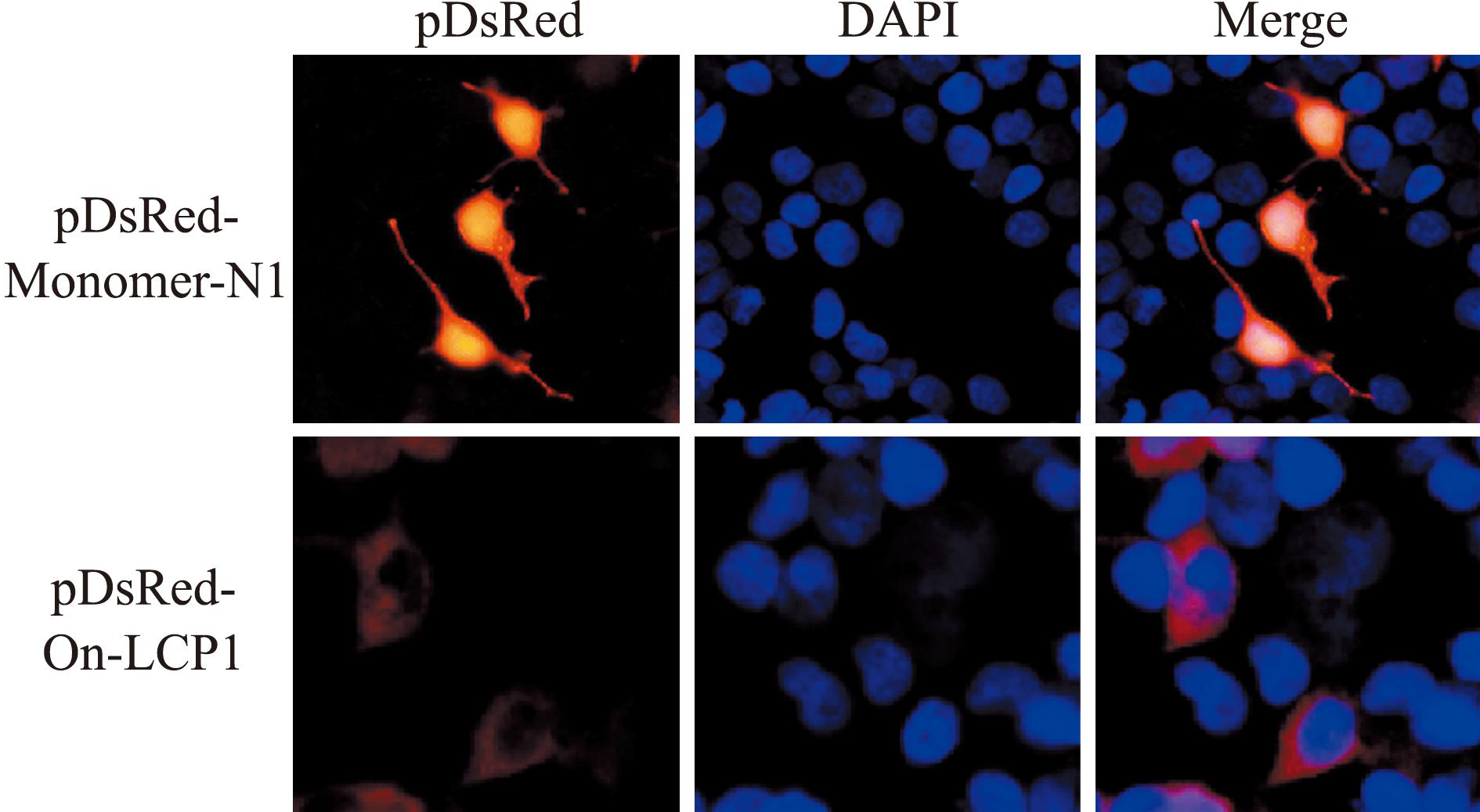 将HEK-293T细胞接种到24孔板(孔直径 15.6 mm),在培养箱中孵育 18 h 后,根据LipofectaminTM 3000 TransfectionReagent说明书分别将空载质粒pDsRed-Monomer-N1和重组质粒pDsRed-OnLCP1转染入细胞中,孵育48 h后用胰蛋白酶消化处理,重悬,吸取部分细胞于处理后的盖玻片上,继续孵育6 h。孵育结束后,先用PBS洗涤细胞2次,然后用40 mg/mL多聚甲醛固定,再滴加4′,6-二脒基-2-苯基吲哚(DAPI)进行细胞核染色。最后用PBS洗涤细胞2次,加入抗荧光猝灭封片剂封片,用激光共聚焦显微镜观察拍照。