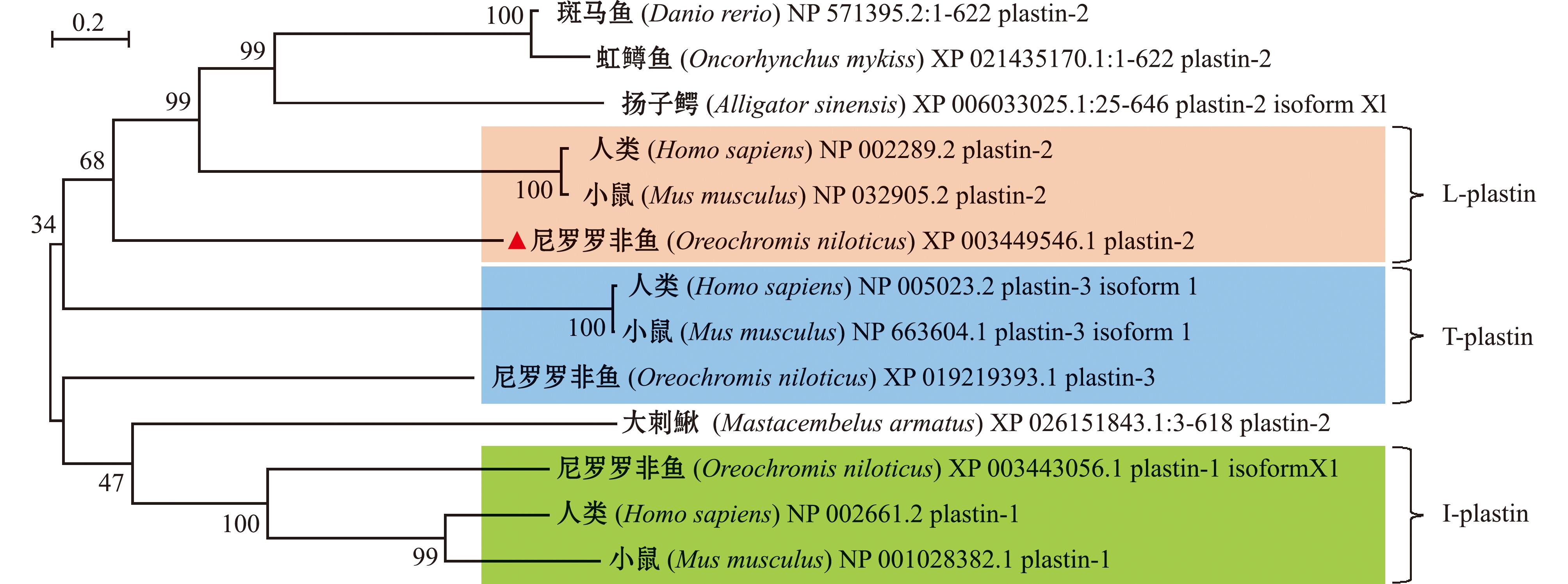 利用MEGA 6.0软件构建尼罗罗非鱼与其他物种plastin蛋白家族的系统进化树,包括人类、小鼠、斑马鱼、虹鳟、扬子鳄、尼罗罗非鱼及大刺鳅等物种。选择这些物种旨在覆盖广泛的进化分支,以明确plastin蛋白家族成员的系统发育关系。结果显示(图6),脊椎动物plastin蛋白分为3个明确的进化分支,分别对应L-Plastin、T-Plastin和I-Plastin亚型。值得注意的是,尼罗罗非鱼plastin蛋白与硬骨鱼类聚为一支,而哺乳动物(如人类和小鼠)聚为一支,这一结果符合脊椎动物的进化分化规律。