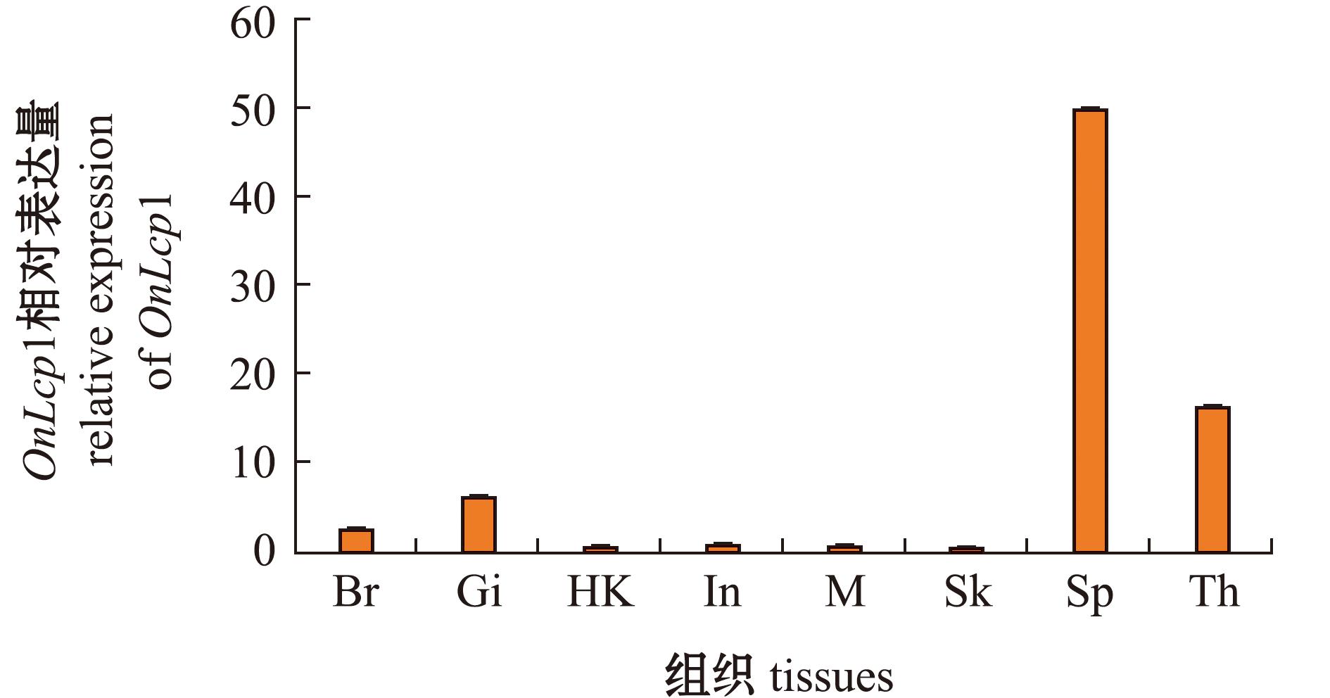 从健康尼罗罗非鱼的鳃、头肾、皮肤、肌肉、肠道、脑、胸腺和脾脏等8个组织中采集样本,以探究OnLCP1基因在尼罗罗非鱼不同组织中的表达情况。