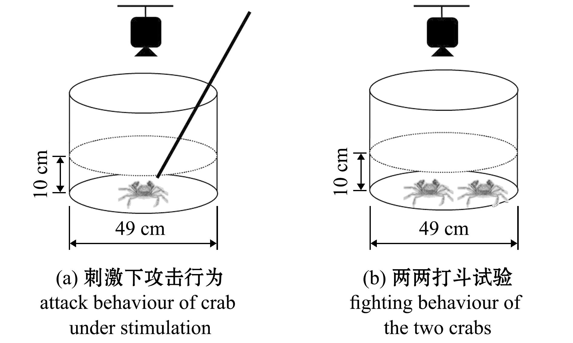 1.2.2 刺激下的攻击行为 试验将健全的单只试验蟹转移至行为学观察桶中进行试验,碱度设置及行为学观察桶规格同上。