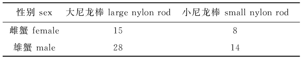 性别 sex大尼龙棒 large nylon rod小尼龙棒 small nylon rod雌蟹 female158雄蟹 male2814