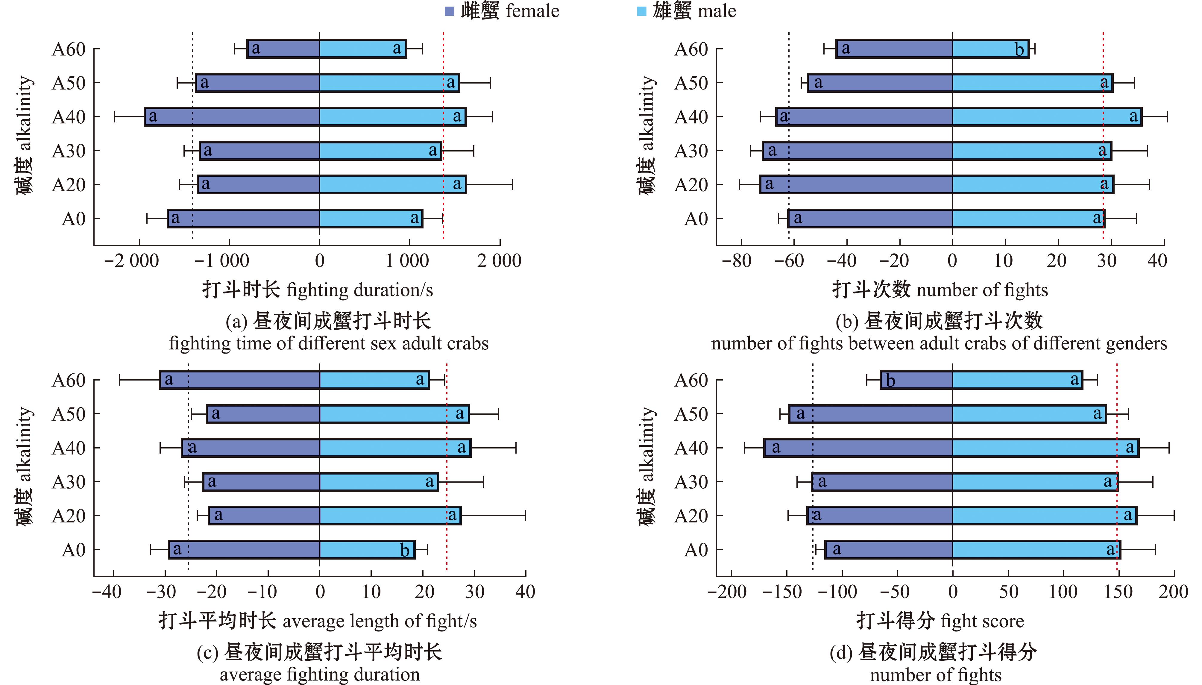 试验结果用平均值±标准误(mean±S.E.)表示,试验数据采用SPSS 27.0软件进行统计分析。成蟹打斗时长、打斗次数、打斗平均时长、打斗得分、刺激下的攻击次数和刺激下的攻击得分的昼夜差异性采用T检验,性别和碱度的组间差异使用单因素方法分析(ANOVA),后采用Ducan多重比较法。显著性水平设置为0.05,图表使用Origin 2022软件绘制。