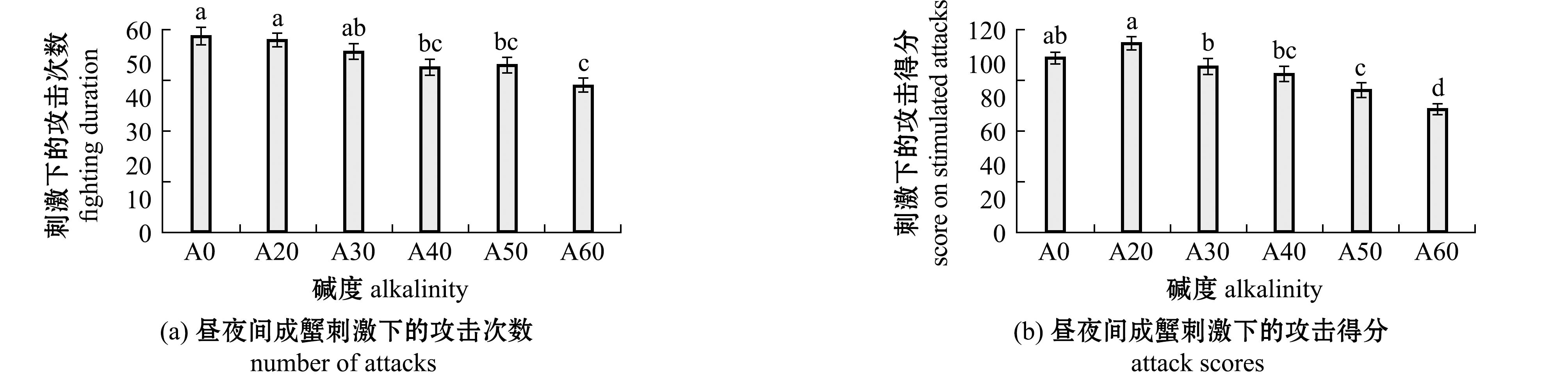 通过对中华绒螯蟹刺激下攻击情况的观察,发现雄蟹刺激下的攻击次数和攻击得分均随碱度升高呈现先增高后降低的趋势(图5)。雌蟹刺激下的攻击得分同样呈现先增高后降低的趋势,而刺激下的攻击次数在整体上呈现随碱度升高而降低的趋势。对比昼夜间成蟹在刺激下的攻击活性,发现雄蟹刺激下的攻击次数略低于雌蟹,攻击性得分略高于雌蟹,但这两项指标在各组雌蟹和雄蟹间无显著性差异。
