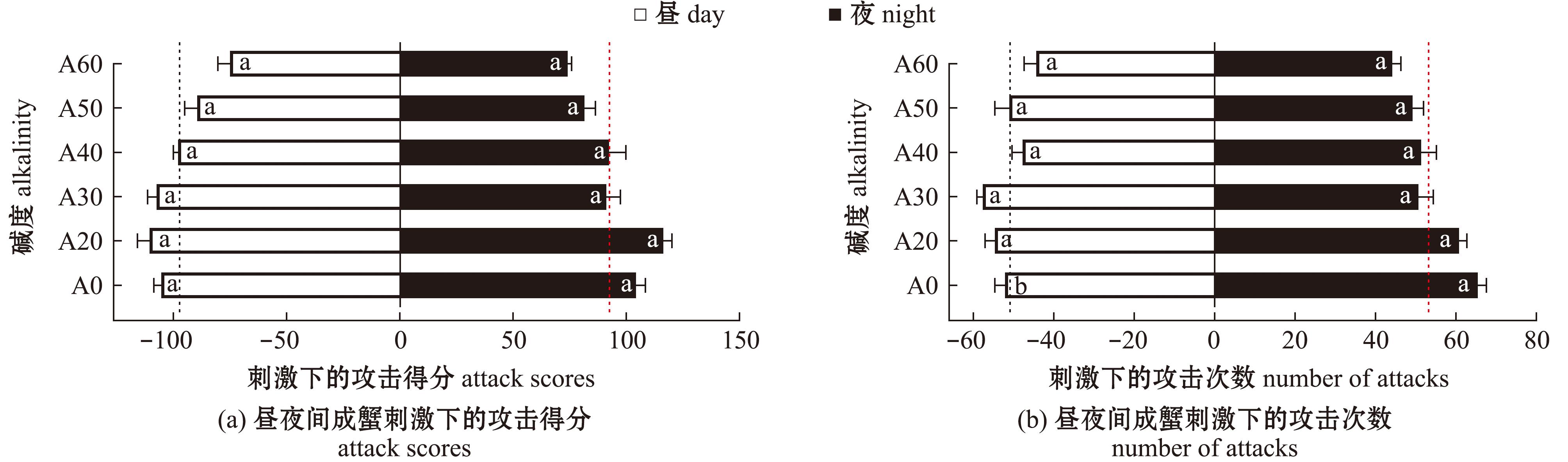 中华绒螯蟹刺激下攻击行为的昼夜变化如图7所示。从图7可见,中华绒螯蟹刺激下的攻击得分随着碱度的增加昼夜均呈现出自A20组到A60组递减的趋势,各性别蟹昼夜之间的攻击得分无显著性差异。随着碱度升高,中华绒螯蟹夜间的攻击次数呈下降趋势,白天则呈现出先升高后降低的趋势。A0组攻击次数昼夜间存在显著性差异,且夜间显著大于白天(P<0.05)。