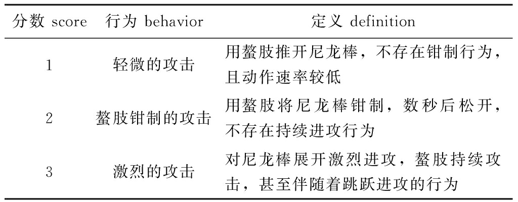 分数 score行为 behavior定义 definition1轻微的攻击用螯肢推开尼龙棒,不存在钳制行为,且动作速率较低2螯肢钳制的攻击用螯肢将尼龙棒钳制,数秒后松开,不存在持续进攻行为3激烈的攻击对尼龙棒展开激烈进攻,螯肢持续攻击,甚至伴随着跳跃进攻的行为