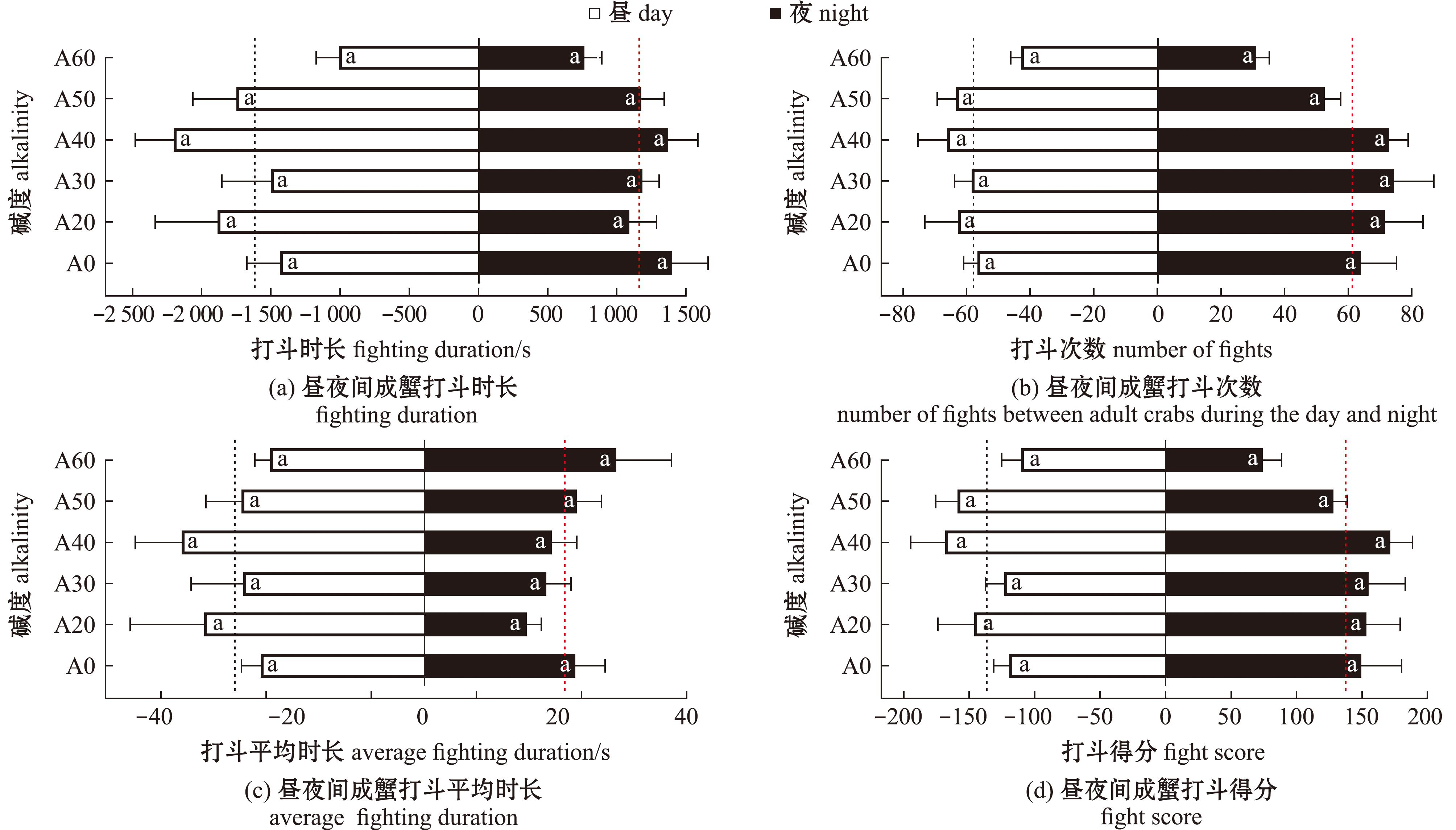 不同碱度下中华绒螯蟹成蟹的打斗行为变化如图2所示,随着碳酸盐碱度的升高,成蟹打斗次数呈现先增高后降低的趋势。在A40组达到最高值,而在碱度为60 mmol/L的A60组打斗次数最少。在打斗时长方面,同样发现在A40组成蟹中达到最高值,A60组成蟹的打斗时长低于A40组,但各组别间无显著性差异。在打斗得分方面,A60组的打斗得分显著低于A20、A30和A40组(P<0.05),与A0组间无显著性差异。昼夜间中华绒螯蟹的打斗平均时长无显著性差异。综上所述,碳酸盐碱度对中华绒螯蟹的打斗行为有显著性影响,在低碱度条件下,中华绒螯蟹的打斗行为更为活跃,而在高碱度条件下,打斗行为明显受到抑制。