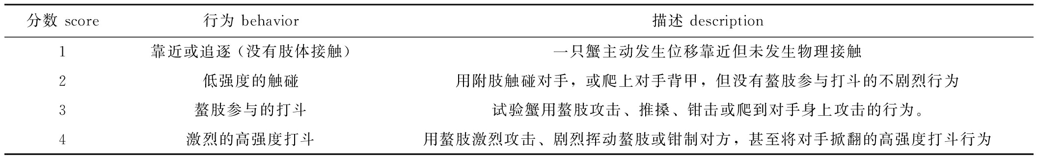 分数 score行为 behavior描述 description1靠近或追逐 (没有肢体接触)一只蟹主动发生位移靠近但未发生物理接触2低强度的触碰用附肢触碰对手,或爬上对手背甲,但没有螯肢参与打斗的不剧烈行为3螯肢参与的打斗试验蟹用螯肢攻击、推搡、钳击或爬到对手身上攻击的行为。4激烈的高强度打斗用螯肢激烈攻击、剧烈挥动螯肢或钳制对方,甚至将对手掀翻的高强度打斗行为