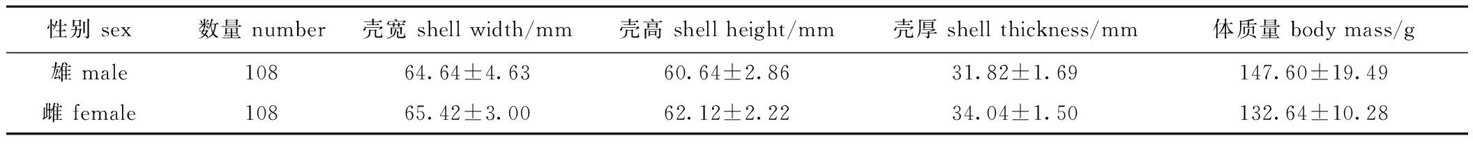 性别 sex数量 number壳宽 shell width/mm壳高 shell height/mm壳厚 shell thickness/mm体质量 body mass/g雄 male10864.64±4.6360.64±2.8631.82±1.69147.60±19.49雌 female10865.42±3.0062.12±2.2234.04±1.50132.64±10.28