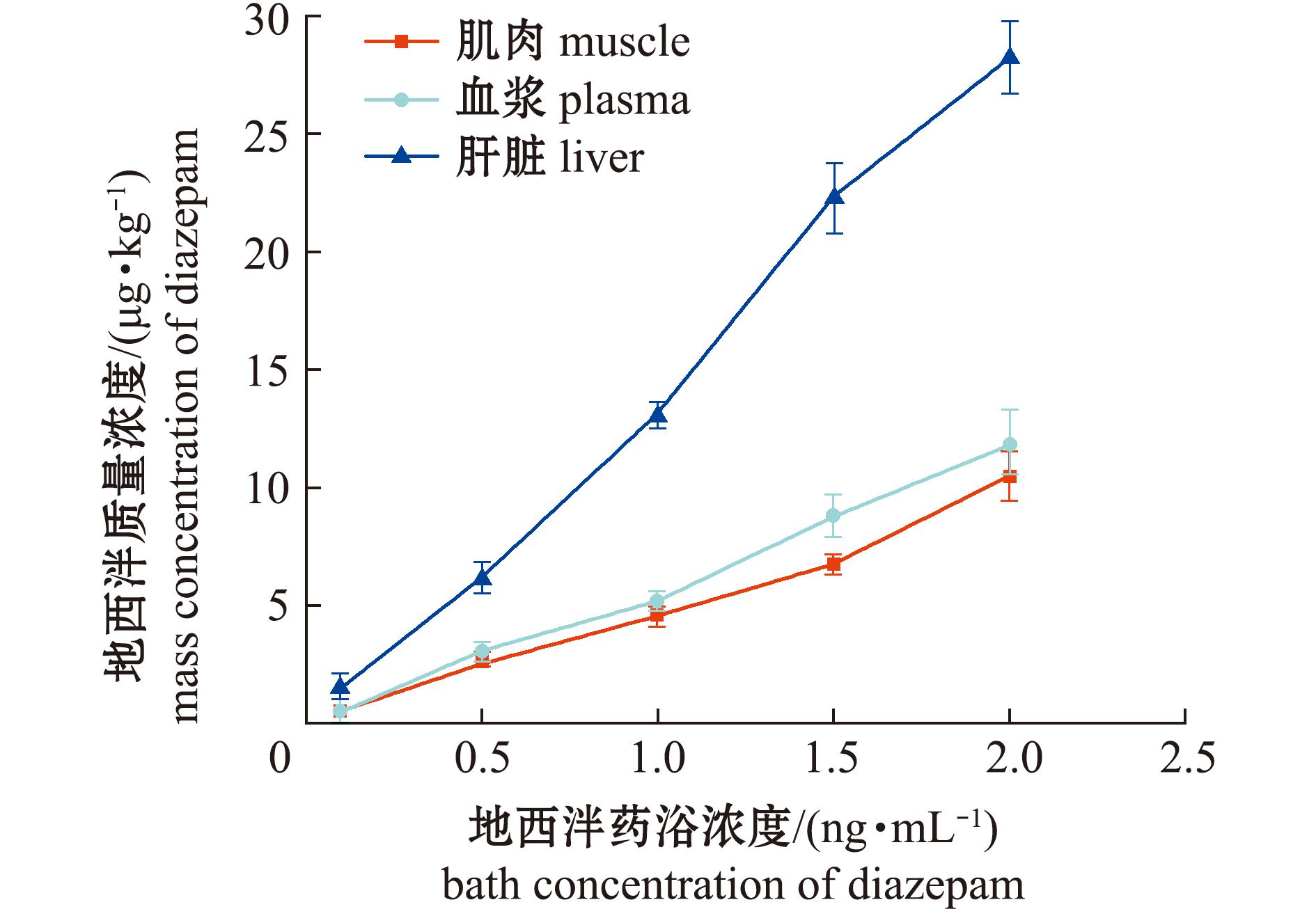 1.2.3 模拟鱼低浓度水平自然环境暴露 采用0.05、0.10、0.50、1.00、1.50、2.00 ng/mL等6个浓度梯度的地西泮药浴暴露72 h,每天更换50%的水体并补充等量地西泮。药浴结束后每个梯度采集6尾鱼作为一组样,设置3组重复。分别制备肌肉、血浆和肝脏样品,于-20 ℃冰箱中保存。