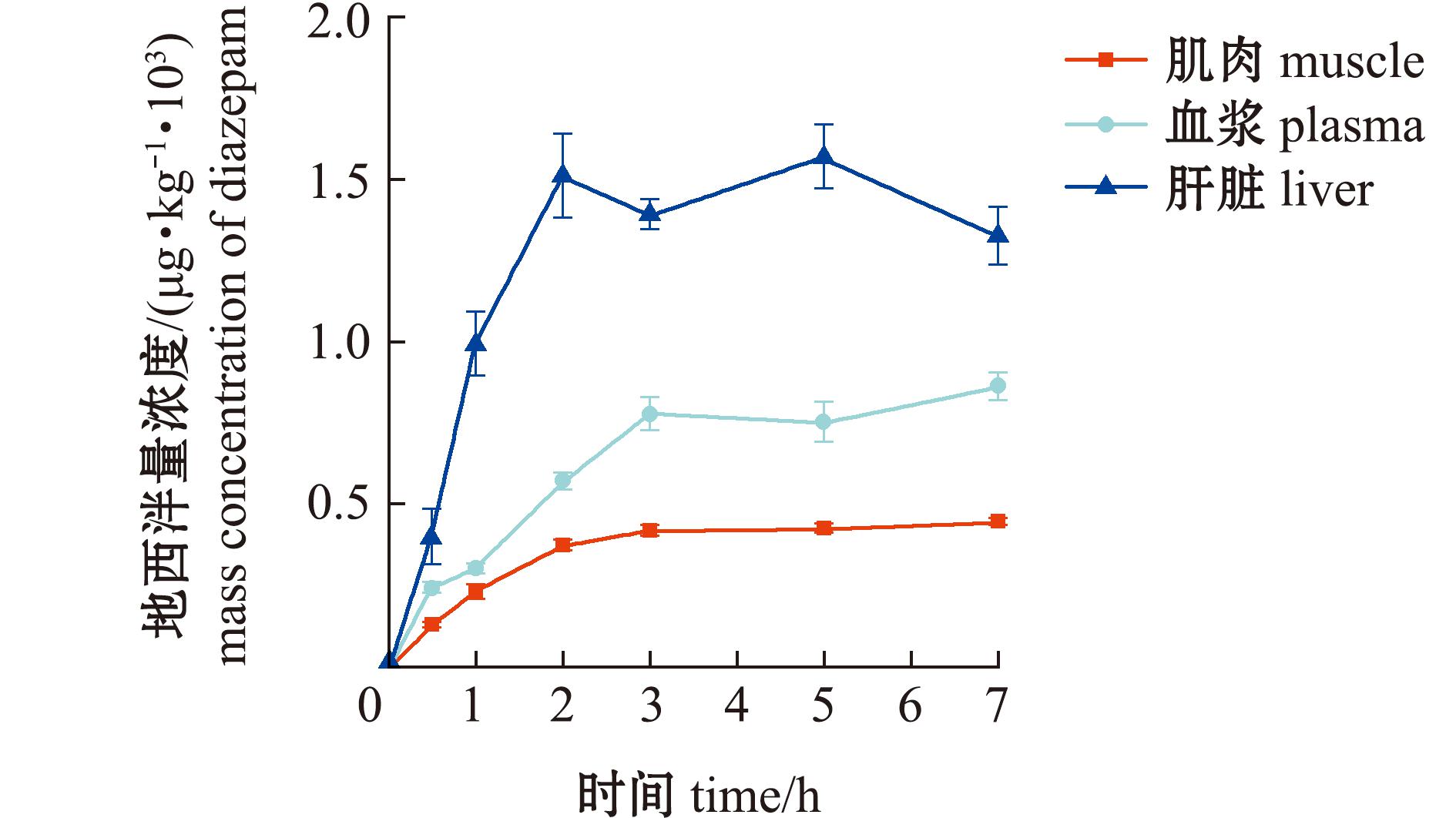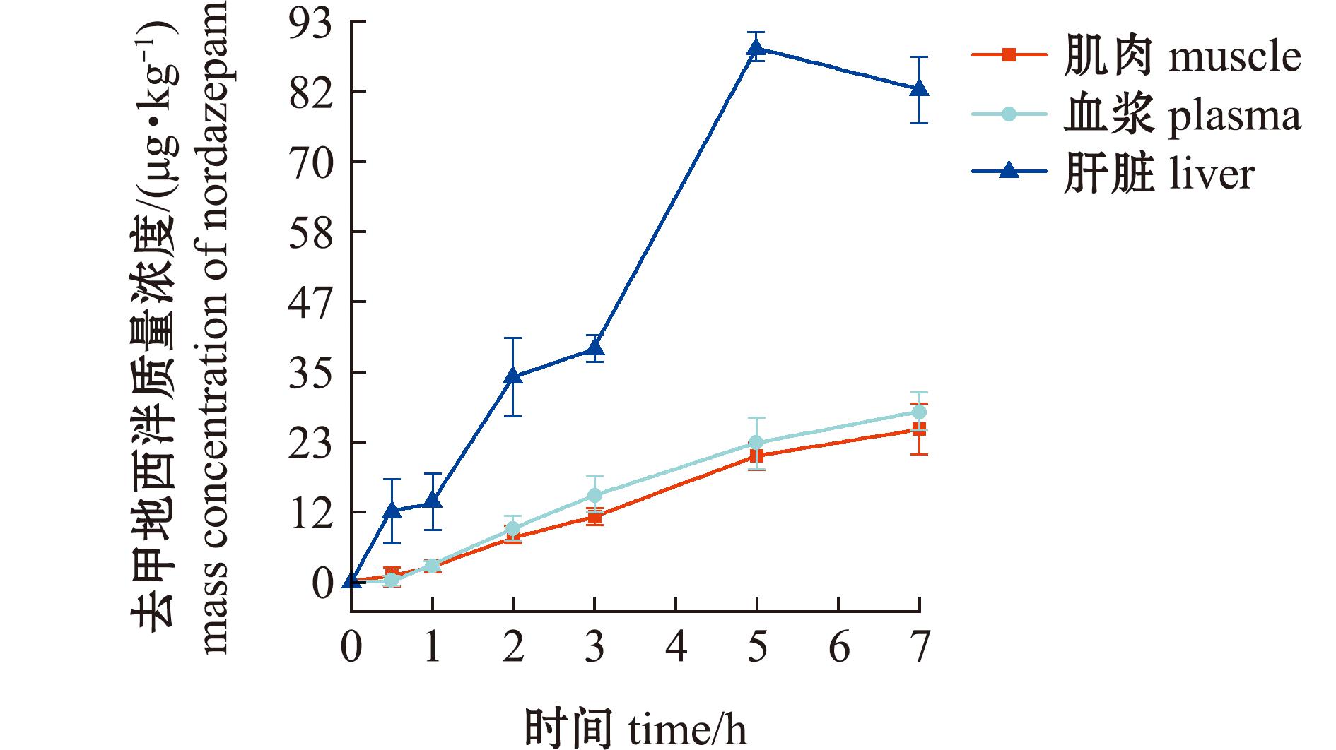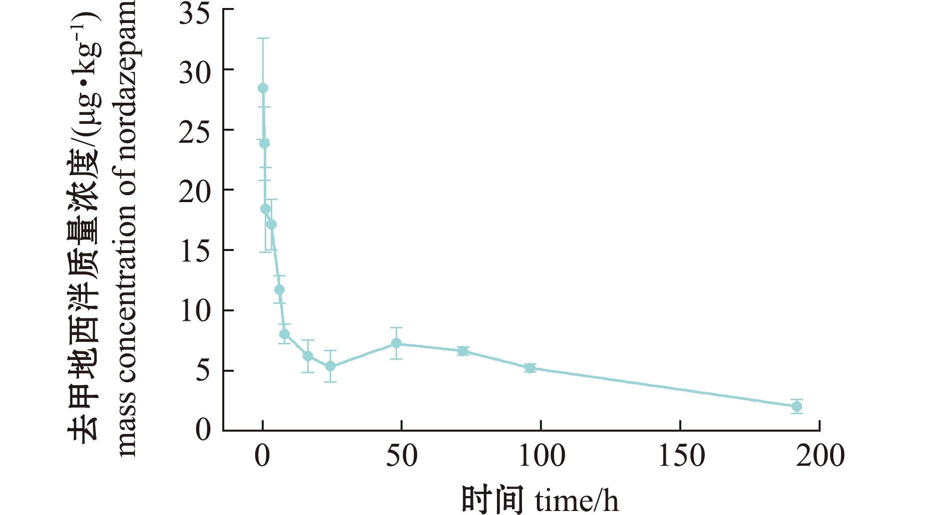 从代谢动力学角度分析,哺乳动物(包括马[12-13] 、大鼠[14]、兔[15]、猫[16]及人类[17])体内地西泮经P450酶系代谢为去甲基地西泮(Nordazepam)和替马地西泮(Temazepam),继而转化为次级代谢物奥沙地西泮(Oxazepam),且转化路径较为明确[13]。然而,水生动物代谢研究较少,现有文献局限于低浓度给药方式[18],缺乏对地西泮及主要代谢产物动态变化特征的系统解析,制约了残留溯源工作的科学判断。