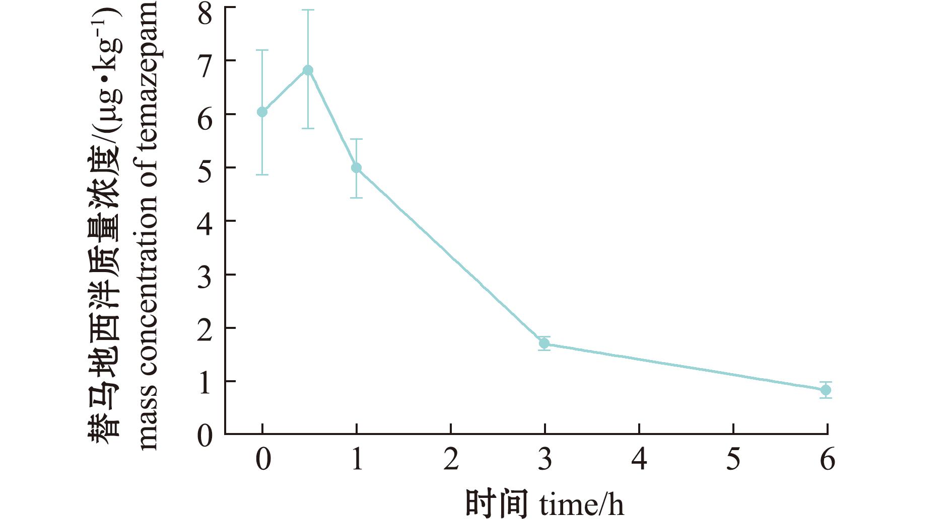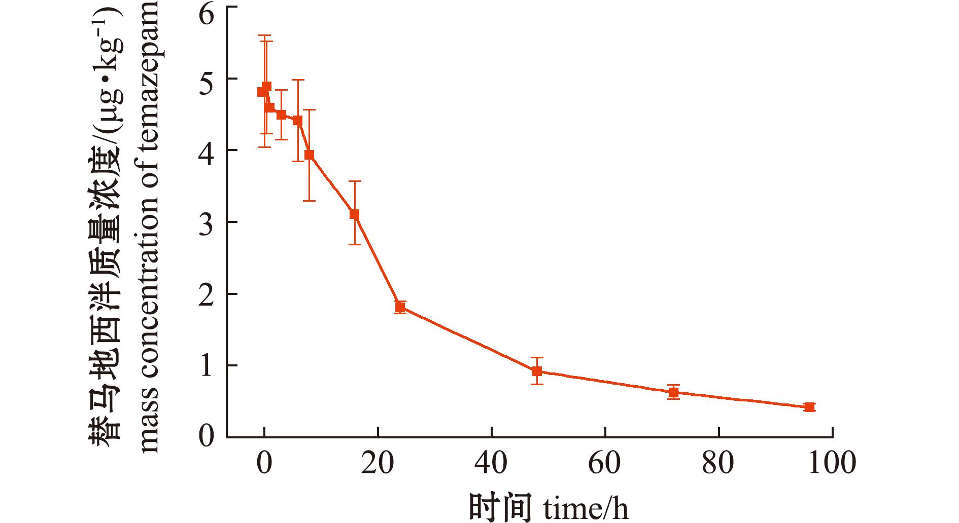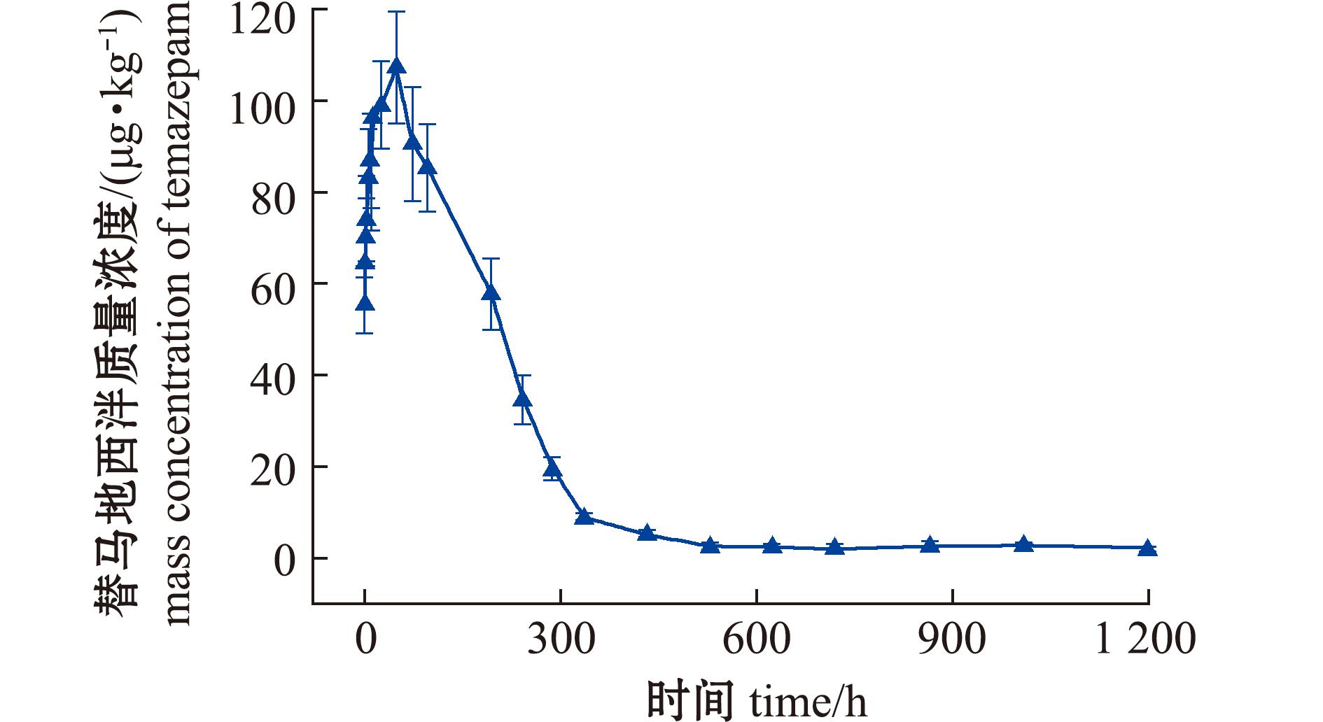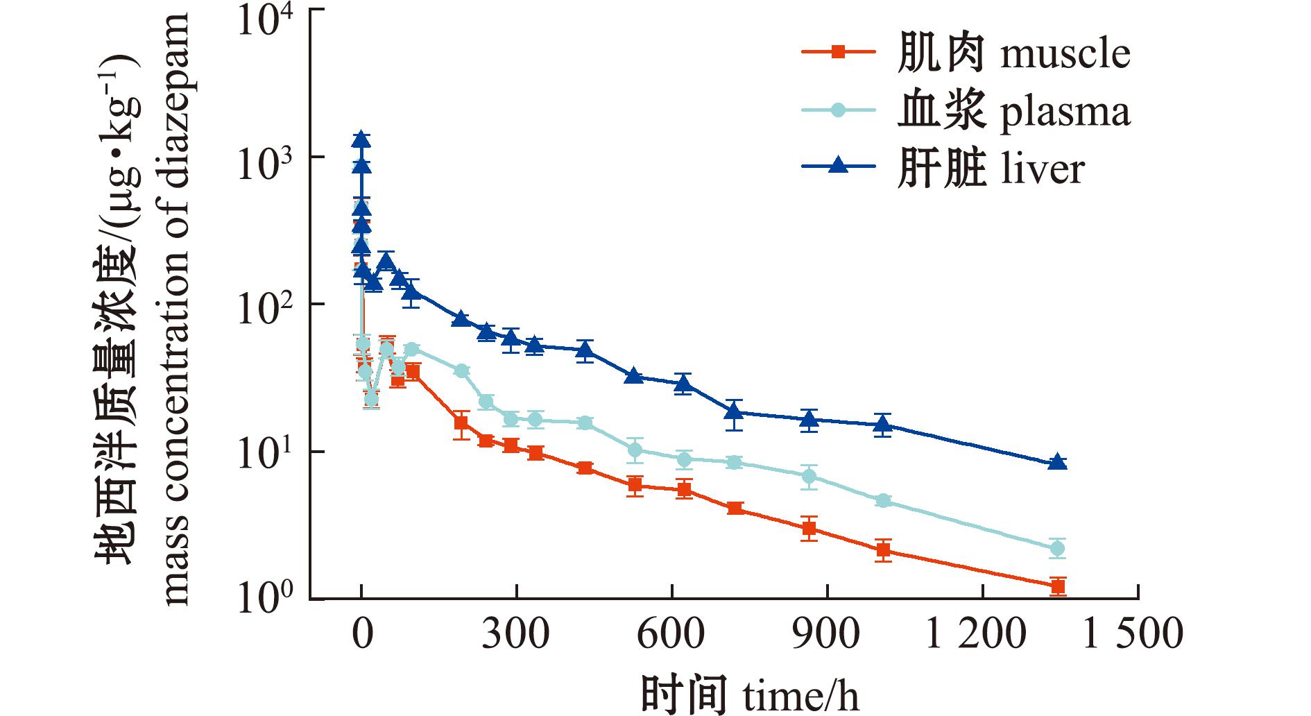 从代谢动力学角度分析,哺乳动物(包括马[12-13] 、大鼠[14]、兔[15]、猫[16]及人类[17])体内地西泮经P450酶系代谢为去甲基地西泮(Nordazepam)和替马地西泮(Temazepam),继而转化为次级代谢物奥沙地西泮(Oxazepam),且转化路径较为明确[13]。然而,水生动物代谢研究较少,现有文献局限于低浓度给药方式[18],缺乏对地西泮及主要代谢产物动态变化特征的系统解析,制约了残留溯源工作的科学判断。
