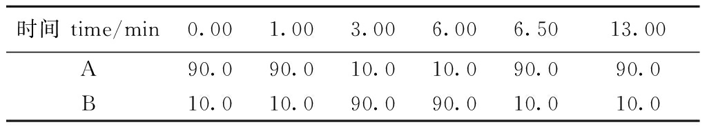 1.2.5 仪器检测方法 色谱条件:Thermo Gold C18(2.1 mm×150 m,3.0 μm);流量:0.25 mL/min;柱温:30 ℃;进样量:10 μL;流动相:A为0.1%甲酸水溶液,B为甲醇溶液,梯度洗脱程序见表1。