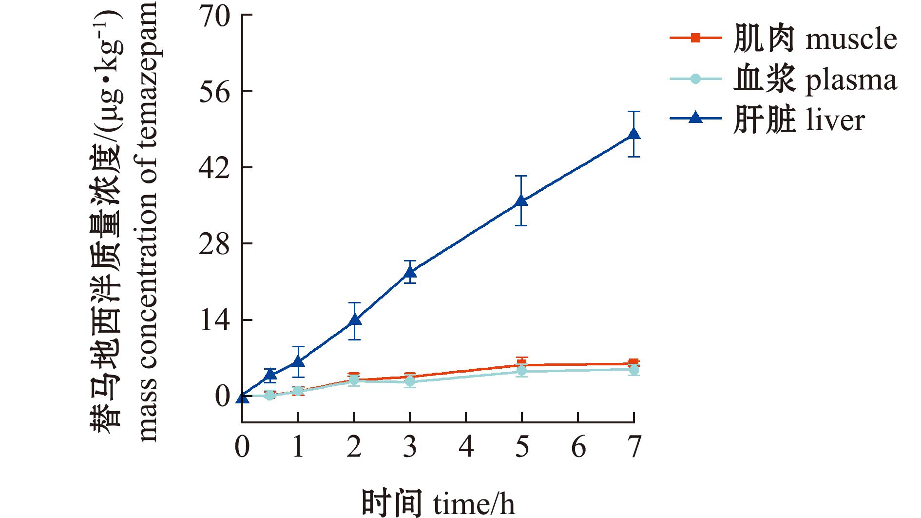 药浴暴露0.5 h即能在血浆中检测出去甲地西泮和替马地西泮,而奥沙地西泮生成呈现明显的时间滞后效应。该次级代谢物在终止药浴0.5 h后首次出现于血浆,在肝脏和肌肉中的检出时间分别延迟至3 h和6 h。这种时空分布特征与代谢多级反应机制相吻合。奥沙地西泮的生成不仅需要前体代谢物作为底物,同时还受限于组织特异性酶活性及底物累积阈值。