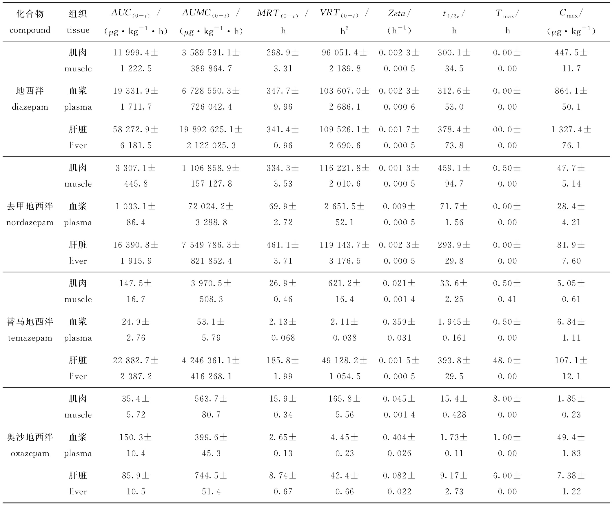 化合物compound组织tissueAUC(0-t)/(μg·kg-1·h)AUMC(0-t)/(μg·kg-1·h)MRT(0-t)/hVRT(0-t)/h2Zeta/(h-1)t1/2z/hTmax/hCmax/(μg·kg-1)肌肉 muscle11 999.4±1 222.53 589 531.1±389 864.7298.9±3.3196 051.4±2 189.80.002 3±0.000 5300.1±34.50.00±0.00447.5±11.7地西泮diazepam血浆 plasma19 331.9±1 711.76 728 550.3±726 042.4347.7±9.96103 607.0±2 686.10.002 3±0.000 6312.6±53.00.00±0.00864.1±50.1肝脏 liver58 272.9±6 181.519 892 625.1±2 122 025.3341.4±0.96109 526.1±2 690.60.001 7±0.000 5378.4±73.800.0±0.001 327.4±76.1肌肉 muscle3 307.1±445.81 106 858.9±157 127.8334.3±3.53116 221.8±2 010.60.001 3±0.000 5459.1±94.70.50±0.0047.7±5.14去甲地西泮nordazepam血浆 plasma1 033.1±86.472 024.2±3 288.869.9±2.722 651.5±52.10.009±0.000 571.7±1.560.00±0.0028.4±4.21肝脏 liver16 390.8±1 915.97 549 786.3±821 852.4461.1±3.71119 143.7±3 176.50.002 3±0.000 5293.9±29.80.00±0.0081.9±7.60肌肉 muscle147.5±16.73 970.5±508.326.9±0.46621.2±16.40.021±0.001 433.6±2.250.50±0.415.05±0.61替马地西泮temazepam血浆 plasma24.9±2.7653.1±5.792.13±0.0682.11±0.0380.359±0.0311.945±0.1610.50±0.006.84±1.11肝脏 liver22 882.7±2 387.24 246 361.1±416 268.1185.8±1.9949 128.2±1 054.50.001 5±0.000 5393.8±29.548.0±0.00107.1±12.1肌肉 muscle35.4±5.72563.7±80.715.9±0.34165.8±5.560.045±0.001 415.4±0.4288.00±0.001.85±0.23奥沙地西泮oxazepam血浆 plasma150.3±10.4399.6±45.32.65±0.134.45±0.230.404±0.0261.73±0.111.00±0.0049.4±1.83肝脏 liver85.9±10.5744.5±51.48.74±0.6742.4±0.660.082±0.0229.17±2.736.00±0.007.38±1.22