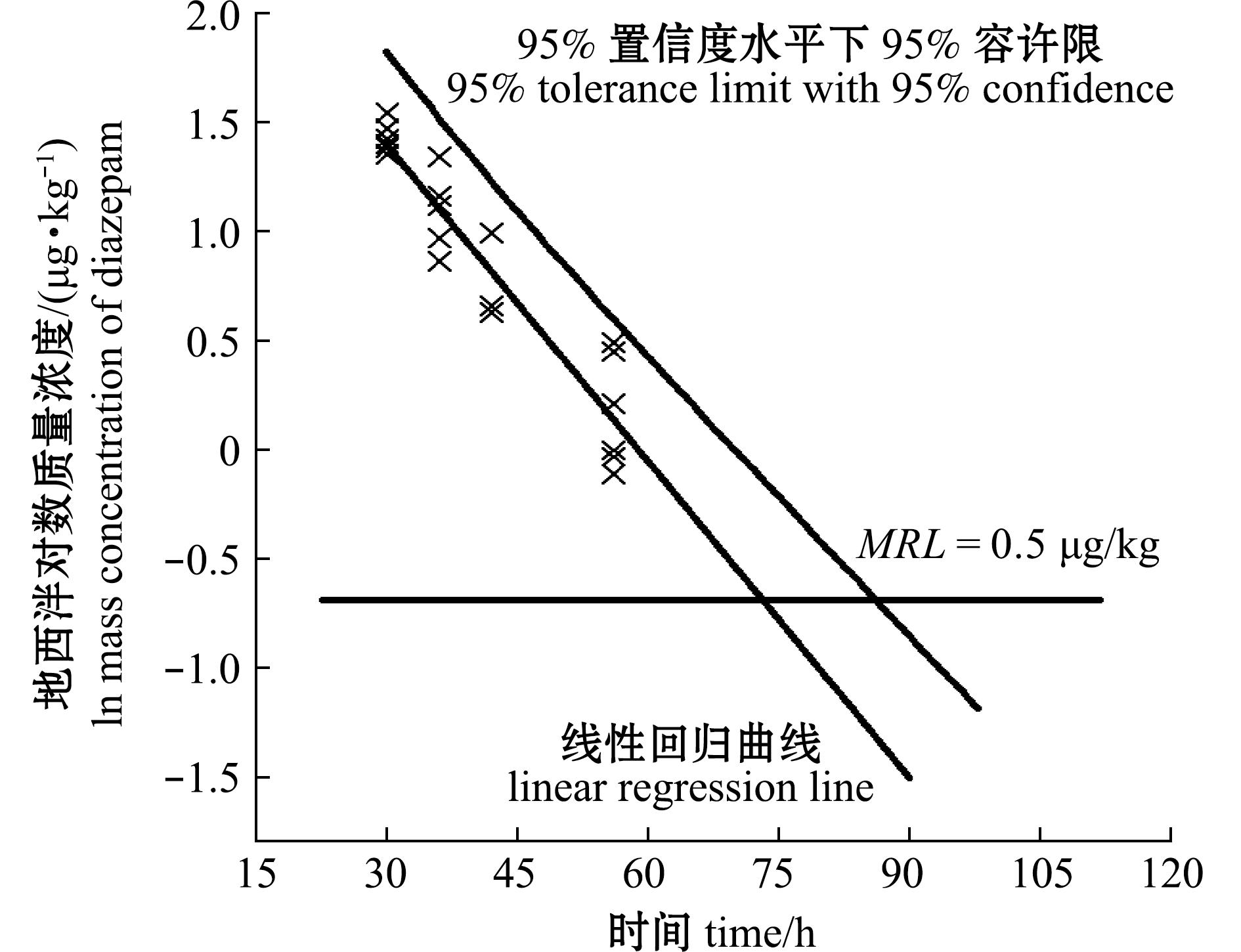 1.2.2 休药期试验 地西泮休药期的计算,采用欧洲药品管理局(European Medicines Agency,EMA)估算休药指南[19]。即lnCt=-kt+lnC0,Ct为不同时间点组织中药物浓度,C0为绘制休药期曲线组织中药物的起始浓度。EMA以动物组织中药残浓度低于最高残留限量(MRL)的时间为休药期(d)。如结果不是整数,应以“d”为单位向上取整。休药期估算使用线性回归结果,以单侧正态分布95%置信度95%容许上限计算药物在组织中不同时间点残留量水平。参与计算的数据需满足方差齐性检验、失拟检验、残差正态分布检验要求。根据国标GB 31650—2019规定,水产中地西泮限量标准(MRL)为“不得检出”。以草鱼肌肉为靶组织,选取代谢末期靶组织中地西泮浓度接近“未检出”的时间点,采用线性外推方式计算达到检测限的时间为休药期。