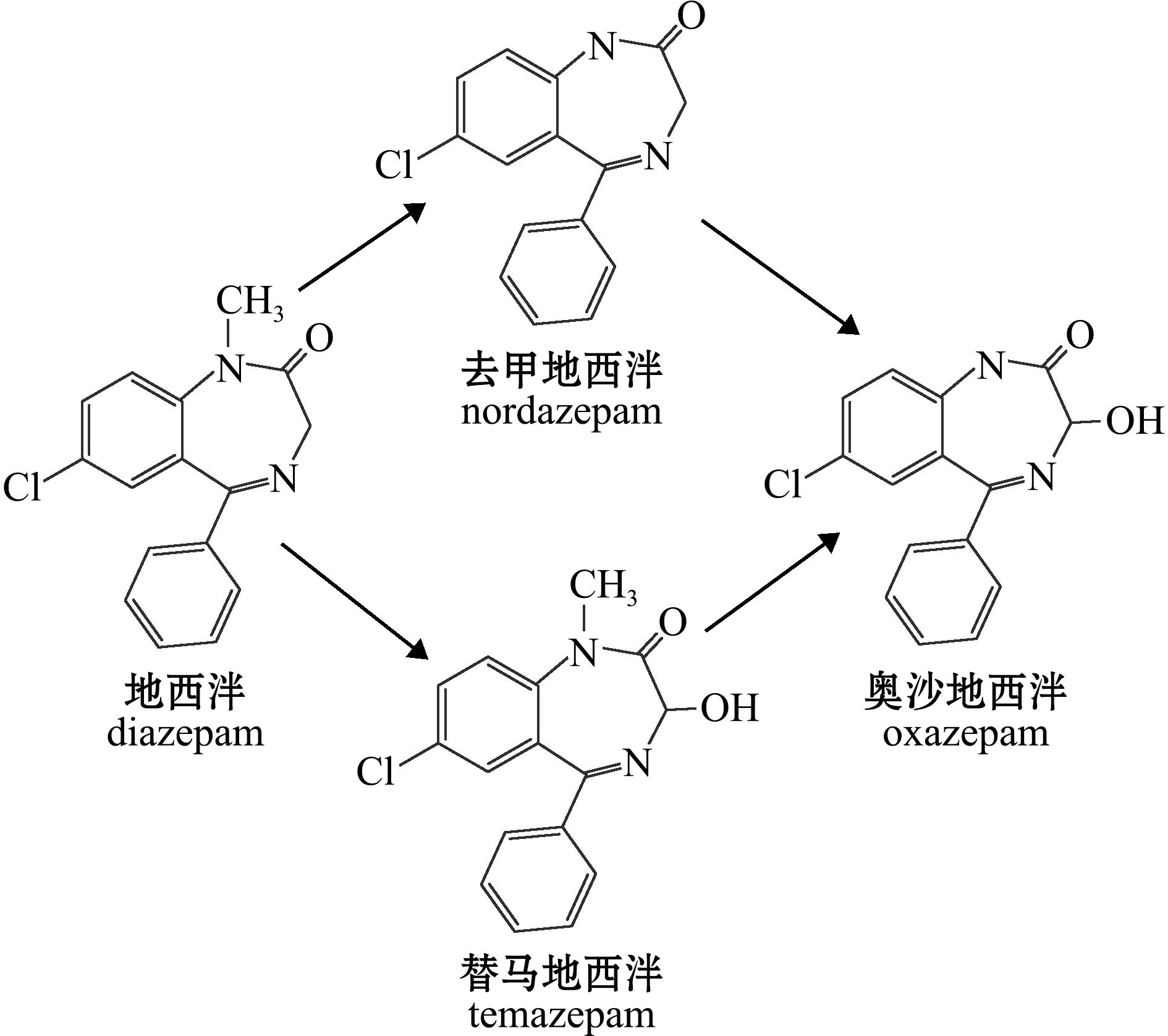 地西泮在动物体内的生物转化过程涉及多级酶促反应(图13)。在Ⅰ相代谢阶段,其代谢途径主要通过细胞色素P450酶系中的CYP2C19催化“N-脱烃基”氧化反应生成去甲地西泮[20];CYP3A亚家族作为关键代谢酶,选择性催化羟化反应生成替马地西泮[21]。这两种初级代谢产物可进一步通过“羟化”和“N-脱烃基”氧化生成次级代谢产物奥沙地西泮。在Ⅱ相代谢过程中,上述Ⅰ相代谢产物经肝微粒体UDP-葡萄糖醛酸转移酶催化,与葡萄糖醛酸结合形成结合型代谢物[13,22]。因此在分析生物样本时需采用β-葡萄糖醛酸苷酶水解预处理,以解离结合的代谢物。