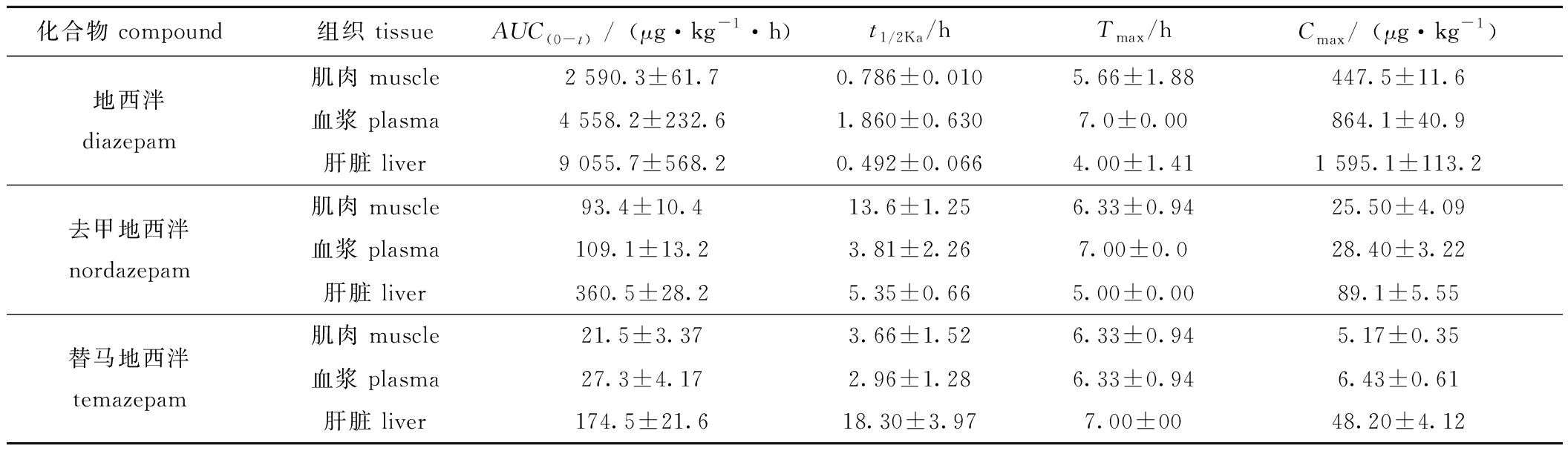 化合物 compound组织 tissueAUC(0-t)/(μg·kg-1·h)t1/2Ka/hTmax/hCmax/(μg·kg-1)肌肉 muscle2 590.3±61.70.786±0.0105.66±1.88447.5±11.6地西泮diazepam血浆 plasma4 558.2±232.61.860±0.6307.0±0.00864.1±40.9肝脏 liver9 055.7±568.20.492±0.0664.00±1.411 595.1±113.2肌肉 muscle93.4±10.413.6±1.256.33±0.9425.50±4.09去甲地西泮nordazepam血浆 plasma109.1±13.23.81±2.267.00±0.028.40±3.22肝脏 liver360.5±28.25.35±0.665.00±0.0089.1±5.55肌肉 muscle21.5±3.373.66±1.526.33±0.945.17±0.35替马地西泮temazepam血浆 plasma27.3±4.172.96±1.286.33±0.946.43±0.61肝脏 liver174.5±21.618.30±3.977.00±0048.20±4.12