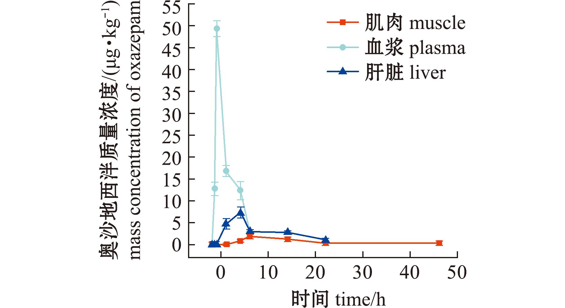 次级代谢物奥沙地西泮呈现独特的组织分布特征。血浆Cmax达(49.4±1.83)μg/kg分别为肌肉的27.3倍、肝脏的6.69倍,AUC(0-t)为(150.3±10.4)μg /kg·h,为肌肉的4.25倍、肝脏的1.75倍,且血浆达峰时间(Tmax)为1 h,显著快于肌肉的8 h和肝脏的6 h。根据这3个参数在各组织中的比例关系,结合其代谢前体(去甲地西泮和替马地西泮)的肝脏富集特征,推测奥沙地西泮可能主要在肝外组织代谢生成。地西泮消除过程中多峰现象说明药物可能存在肝肠循环[27],由于动物肠道上皮细胞分布大量药物代谢酶,如CYP3A酶是除肝脏外含量和活性最高的器官[31],而该亚型酶正是地西泮代谢的关键酶[12]。奥沙地西泮可能在主要肠道上皮细胞代谢生成后,再通过肠壁进入血液循环系统,导致血浆的达峰时间短、达峰浓度高。同时,奥沙地西泮的亲脂性(XLogP3=2.24)相较于地西泮(XLogP3=3.0)有所降低,跨膜能力的减弱一定程度上也提高了其在血浆中的分布。