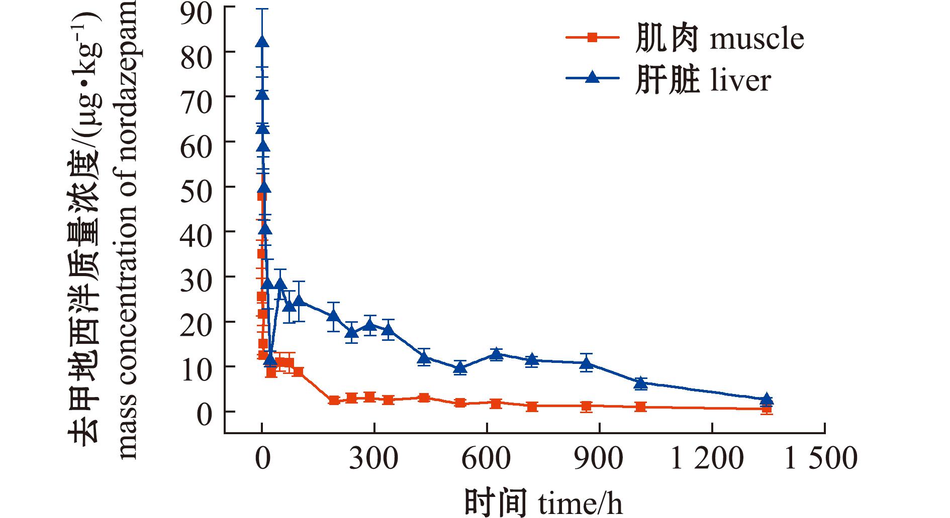 去甲基地西泮在肌肉、血浆和肝脏的Cmax分别为(47.70±5.14)、(28.40±4.21)、(81.90±7.60)μg/kg,其中,血浆和肝脏Tmax与母体药物同步为0 h,而肌肉存在0.5 h滞后。消除过程各组织前16 h呈快速衰减,此后在低浓度水平缓慢消除,血浆在192 h后低于检测限。肝脏消除曲线呈现显著波动特征,可能与相关酶活性节律相关。
