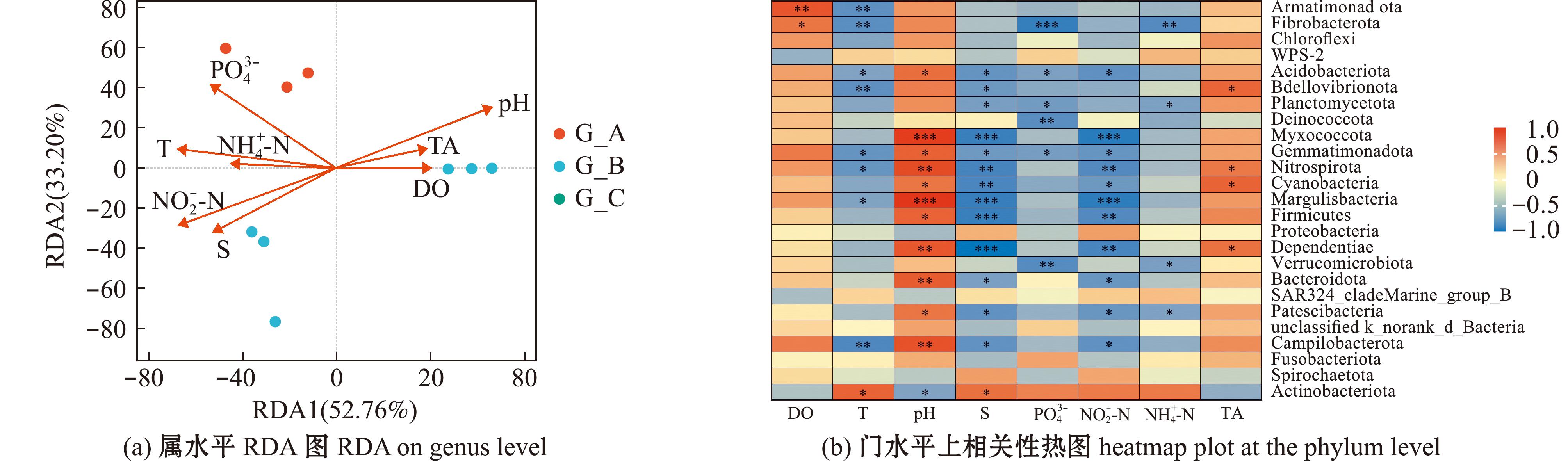 相关性热图(图8(b))揭示了沉积物微生物类群与环境因子之间的关系,分析显示,Armatimonadota和Planctomycetota与DO、T和pH呈现显著正相关,Chloroflexi和Margulisbacteria则与