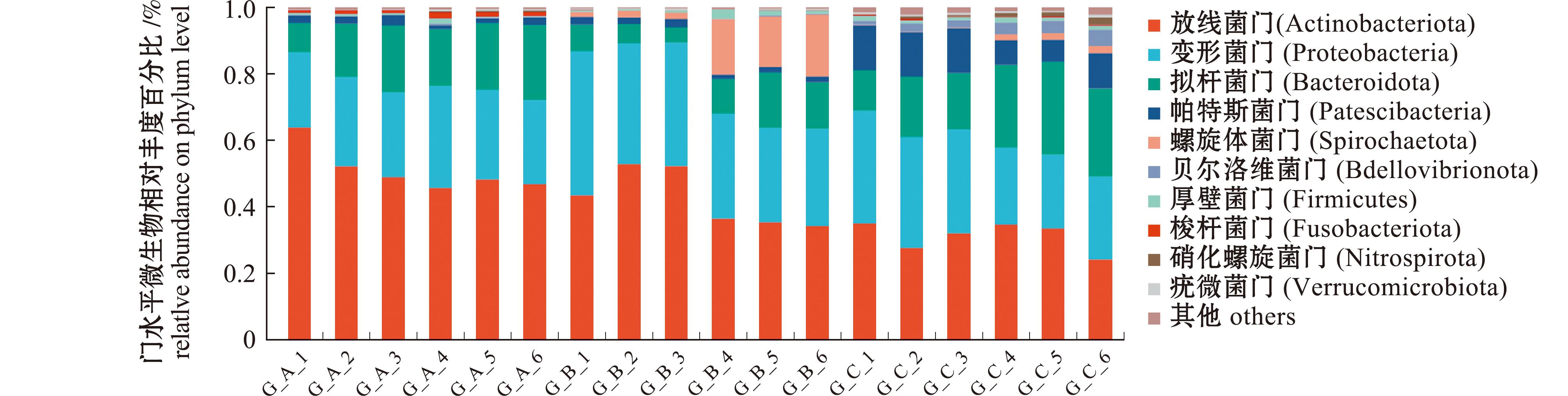 2.2.2 工厂化循环水养殖池塘和生物滤池微生物群落组成分析 微生物群落中(图5),放线菌门(Actinobacteriota)和变形菌门(Proteobacteria)在A、B系统中均占主导地位(80%以上),在A系统中丰度较高,尤其在养殖池中G_A_1至G_A_4样品中占比稳定在50%以上;其中A系统中的梭杆菌门(Fusobacteriota)的占比远大于其余两个系统。变形菌门为次优势菌门,在B系统中显著丰富(30%~40%),尤其在鱼池水体(G_B_1)和生物滤池(G_B_2)样品中达到峰值,而在A、C系统中比例较低(约20%~30%);拟杆菌门(Bacteroidota)在多数单元中占比为第三,而在B系统第二次采样时,拟杆菌门迅速减少而螺旋体门(Spirochaetota)迅速增加。
