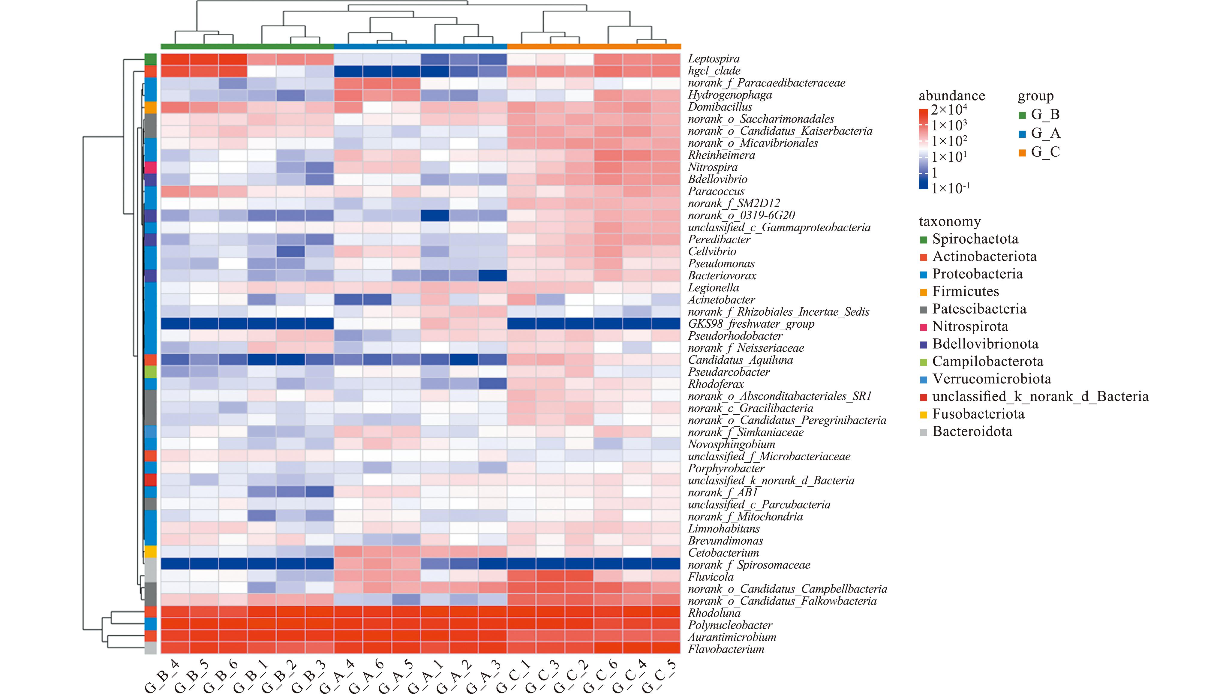 通过对微生物属水平群落数据的分析可以看出(图6),A系统中,玫月菌属Rhodoluna、Auranti-microbium和Polynucleobacter占据绝对优势,其中Rhodoluna在3个系统中丰度稳定且最高。在C系统中Polynucleobacter和Fluviicola丰度显著升高,而norank_o_Candidatus_Falkowbacteria及g_hgcI_clade在G_C组中呈现特异性富集。B系统的核心菌属Polynucleobacter丰度达到各组峰值,同时Leptospira和norank_f_Parachlamydiaceae在该组显著增加。部分菌属表现出明显的组间排斥性分布:如GKS98_freshwater_group在A系统中丰度较高,而在其他组几乎消失;Cetobacterium在A系统维持在高水平,在G_B/G_C组骤降。此外,A、B系统中的低丰度菌属如Candidatus_Aquiluna、g_Bdellovibrio和g_Peredibacter在C系统中呈现较高数值。