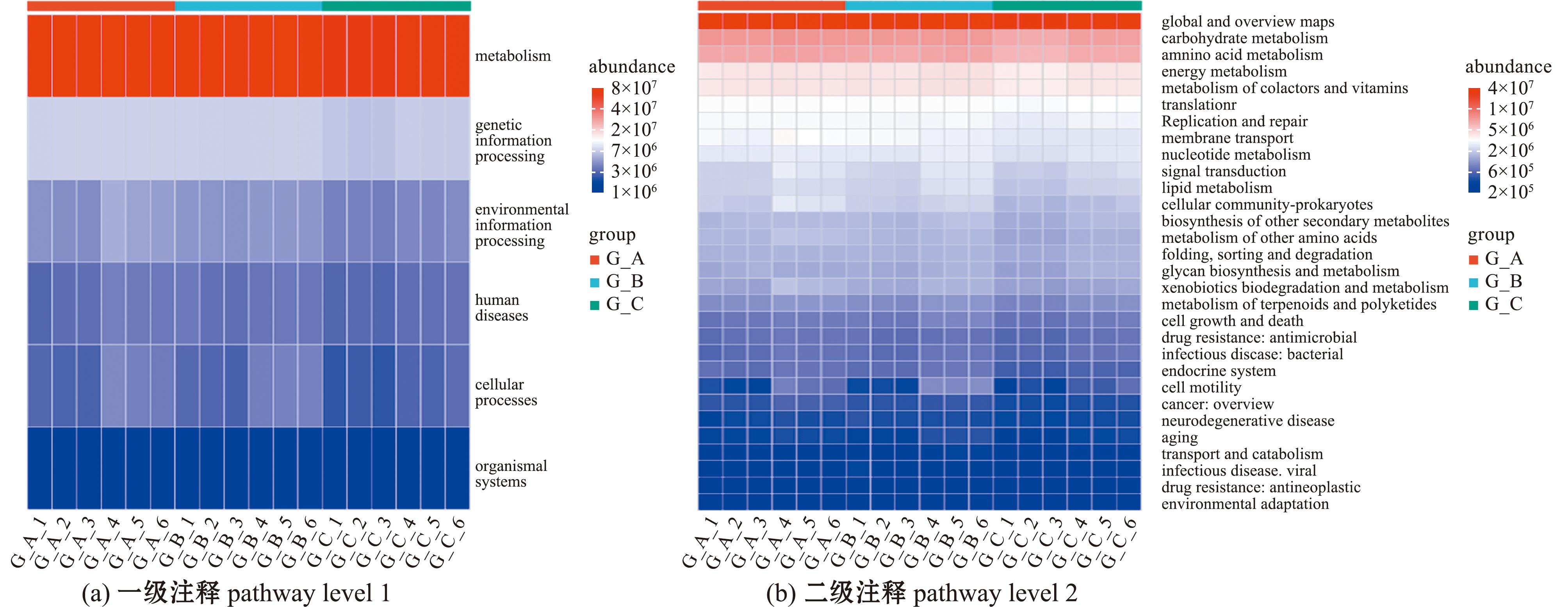 2.2.3 工厂化循环水养殖池塘和生物滤池微生物群落功能预测 通过对3个工厂循环水养殖系统微生物群落进行KEGG Pathway一级功能注释分析(图7(a)),结果显示,代谢功能(metabolism)在3大系统的功能注释中占据绝对优势,其次为遗传信息处理(genetic information processing)。进一步对二级功能注释结果进行解析(图7(b))发现,微生物功能主要富集于碳水化合物代谢(carbohydrate metabolism)、氨基酸代谢(amino acid metabolism)、辅因子与维生素代谢(cofactor and vitamin metabolism)、能量代谢(energy metabolism)等核心代谢通路,同时亦在遗传信息处理相关的DNA复制与修复机制(DNA replication and repair)及环境响应相关的膜运输(membrane transport)等通路中呈现显著富集特征。