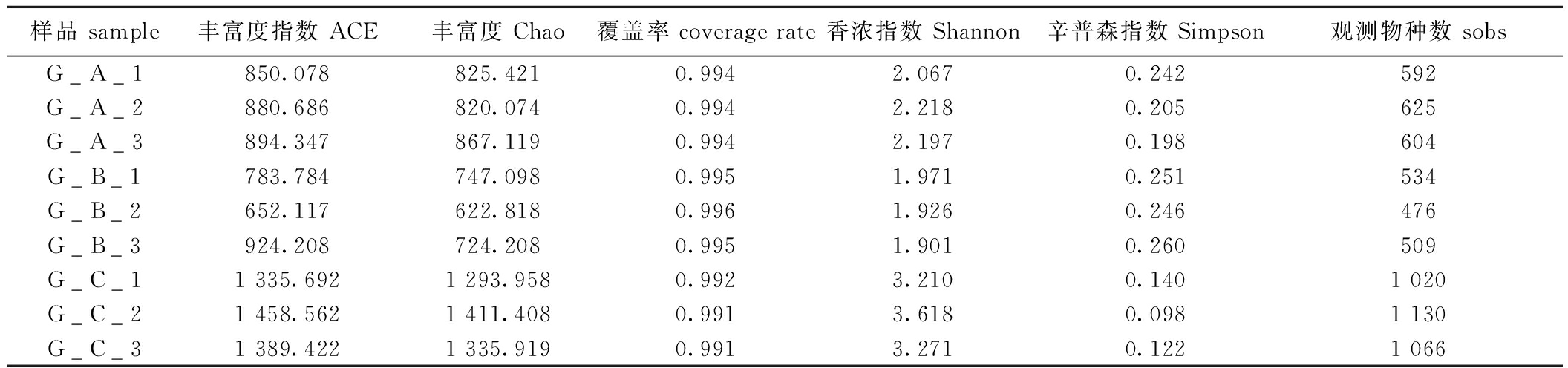 样品 sample丰富度指数 ACE丰富度 Chao覆盖率 coverage rate香浓指数 Shannon辛普森指数 Simpson观测物种数 sobsG_A_1850.078825.4210.9942.0670.242592G_A_2880.686820.0740.9942.2180.205625G_A_3894.347867.1190.9942.1970.198604G_B_1783.784747.0980.9951.9710.251534G_B_2652.117622.8180.9961.9260.246476G_B_3924.208724.2080.9951.9010.260509G_C_11 335.6921 293.9580.9923.2100.1401 020G_C_21 458.5621 411.4080.9913.6180.0981 130G_C_31 389.4221 335.9190.9913.2710.1221 066