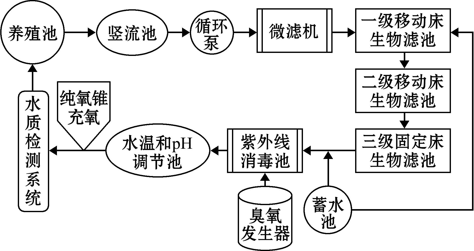 该循环水养殖系统建于宁夏回族自治区银川市贺兰县科海渔业有限公司,该厂区共有3个正常运行的工厂化循环水养殖系统(图1(a)),每个系统由6个直径6 m高1.2 m的圆形养殖池,以及微滤机、生物滤池、紫外线消毒设备、液氧罐等单元组成。其中生物滤池有3级,前2级为移动床反应器(填有的生物滤料为比表面积600 m2/m3的多孔塑料环,图1(b)),后1级为固定床反应器;第1级移动床反应器面积为14.25 m2,第2级移动床反应器面积为13.8 m2,固定床反应器面积为24.6 m2,工艺流程如图2所示。