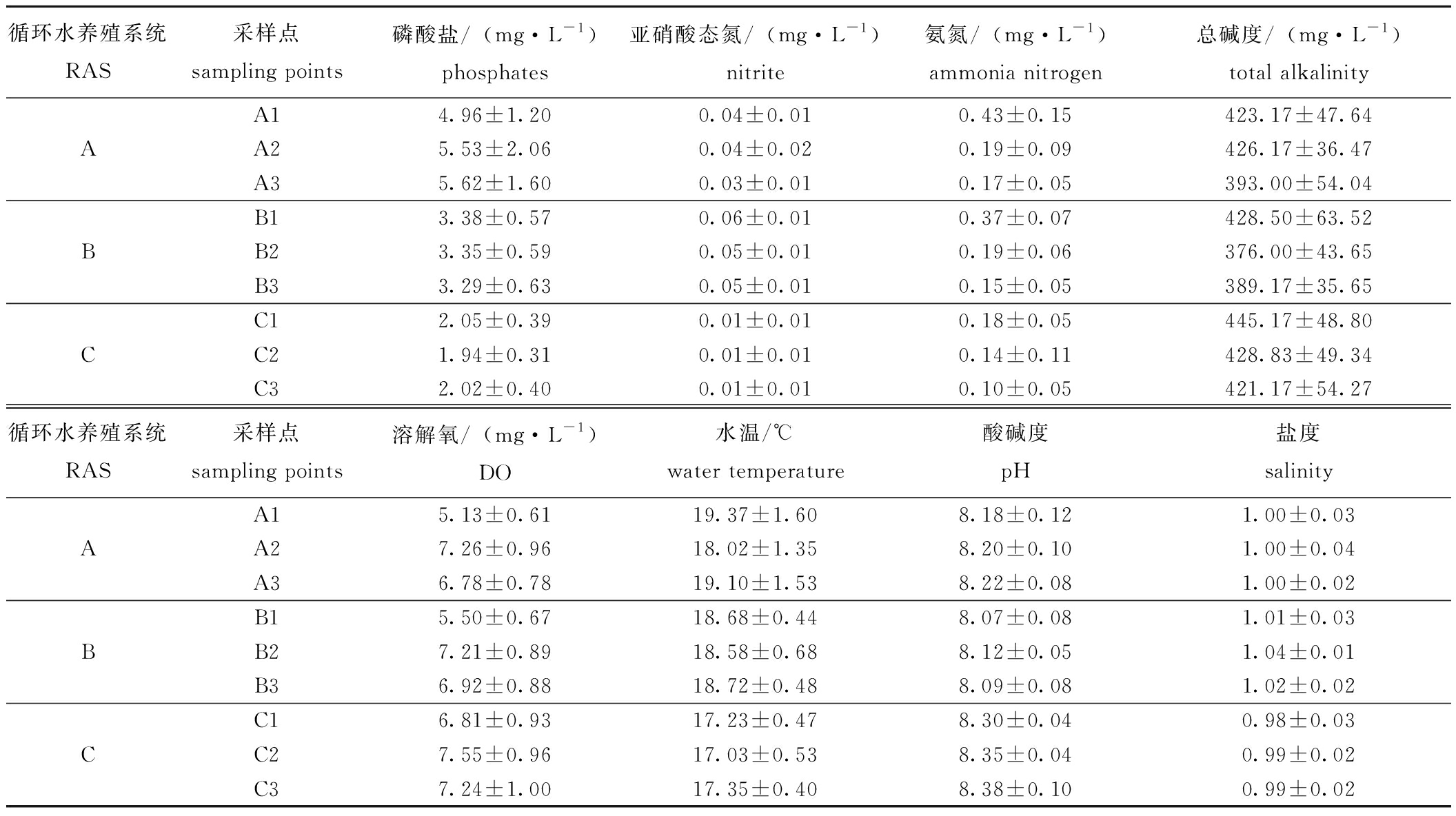 循环水养殖系统RAS采样点sampling points磷酸盐/(mg·L-1)phosphates亚硝酸态氮/(mg·L-1)nitrite氨氮/(mg·L-1)ammonia nitrogen总碱度/(mg·L-1)total alkalinityA14.96±1.200.04±0.010.43±0.15423.17±47.64AA25.53±2.060.04±0.020.19±0.09426.17±36.47A35.62±1.600.03±0.010.17±0.05393.00±54.04B13.38±0.570.06±0.010.37±0.07428.50±63.52BB23.35±0.590.05±0.010.19±0.06376.00±43.65B33.29±0.630.05±0.010.15±0.05389.17±35.65C12.05±0.390.01±0.010.18±0.05445.17±48.80CC21.94±0.310.01±0.010.14±0.11428.83±49.34C32.02±0.400.01±0.010.10±0.05421.17±54.27循环水养殖系统RAS采样点sampling points溶解氧/(mg·L-1)DO水温/℃water temperature酸碱度pH盐度salinityA15.13±0.6119.37±1.608.18±0.121.00±0.03AA27.26±0.9618.02±1.358.20±0.101.00±0.04A36.78±0.7819.10±1.538.22±0.081.00±0.02B15.50±0.6718.68±0.448.07±0.081.01±0.03BB27.21±0.8918.58±0.688.12±0.051.04±0.01B36.92±0.8818.72±0.488.09±0.081.02±0.02C16.81±0.9317.23±0.478.30±0.040.98±0.03CC27.55±0.9617.03±0.538.35±0.040.99±0.02C37.24±1.0017.35±0.408.38±0.100.99±0.02
