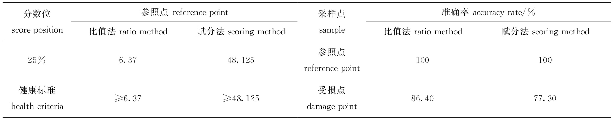 分数位score position参照点 reference point比值法ratio method赋分法scoring method采样点sample准确率 accuracy rate/%比值法ratio method赋分法scoring method25%6.3748.125参照点reference point100100健康标准health criteria≥6.37≥48.125受损点damage point86.4077.30