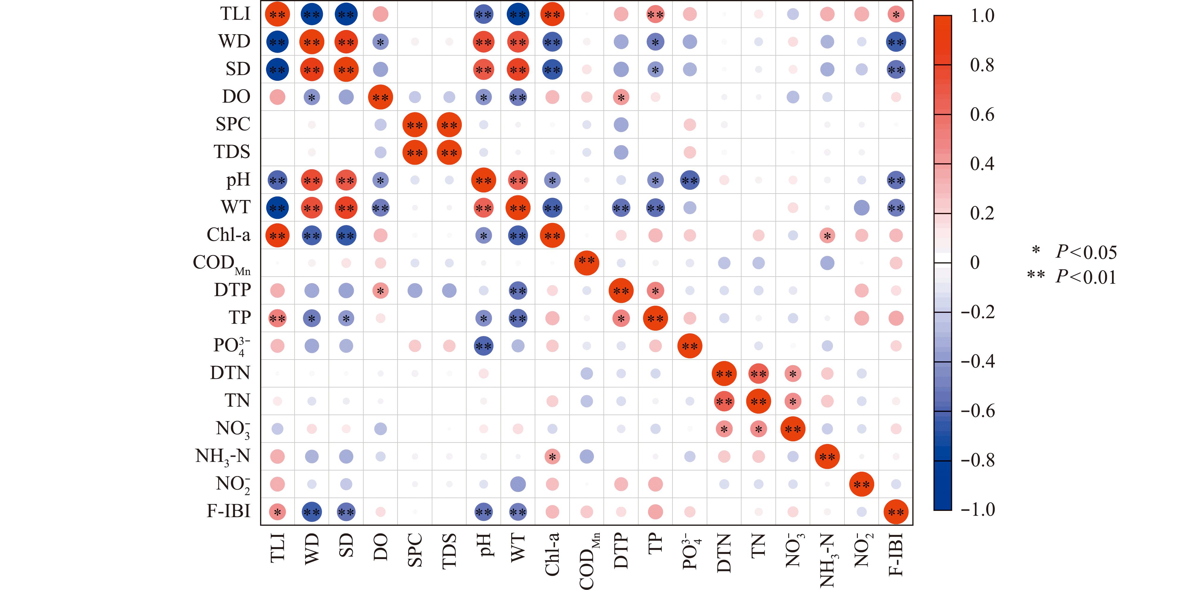 Spearman相关性分析结果显示,F-IBI指数与水深(WD)、透明度(SD)、pH、水温(WT)显著负相关,与综合营养状态指数(TLI)显著正相关(图4)。