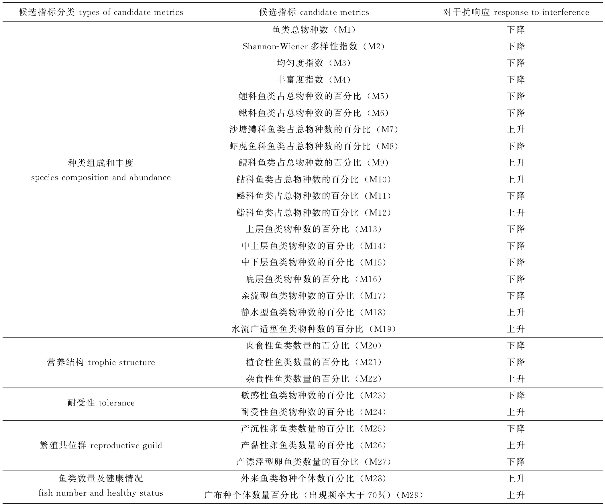 候选指标分类 types of candidate metrics候选指标 candidate metrics对干扰响应 response to interference鱼类总物种数(M1)下降Shannon-Wiener多样性指数(M2)下降均匀度指数(M3)下降丰富度指数(M4)下降鲤科鱼类占总物种数的百分比(M5)下降鳅科鱼类占总物种数的百分比(M6)下降沙塘鳢科鱼类占总物种数的百分比(M7)上升虾虎鱼科鱼类占总物种数的百分比(M8)下降种类组成和丰度species composition and abundance鳢科鱼类占总物种数的百分比(M9)上升鲇科鱼类占总物种数的百分比(M10)上升鲿科鱼类占总物种数的百分比(M11)下降鮨科鱼类占总物种数的百分比(M12)上升上层鱼类物种数的百分比(M13)下降中上层鱼类物种数的百分比(M14)下降中下层鱼类物种数的百分比(M15)下降底层鱼类物种数的百分比(M16)下降亲流型鱼类物种数的百分比(M17)下降静水型鱼类物种数的百分比(M18)上升水流广适型鱼类物种数的百分比(M19)上升肉食性鱼类数量的百分比(M20)下降营养结构 trophic structure植食性鱼类数量的百分比(M21)下降杂食性鱼类数量的百分比(M22)上升耐受性 tolerance敏感性鱼类物种数的百分比(M23)下降耐受性鱼类物种数的百分比(M24)上升产沉性卵鱼类数量的百分比(M25)下降繁殖共位群 reproductive guild产黏性卵鱼类数量的百分比(M26)上升产漂浮型卵鱼类数量的百分比(M27)下降鱼类数量及健康情况fish number and healthy status外来鱼类物种个体数百分比(M28)上升广布种个体数量百分比(出现频率大于70%)(M29)上升
