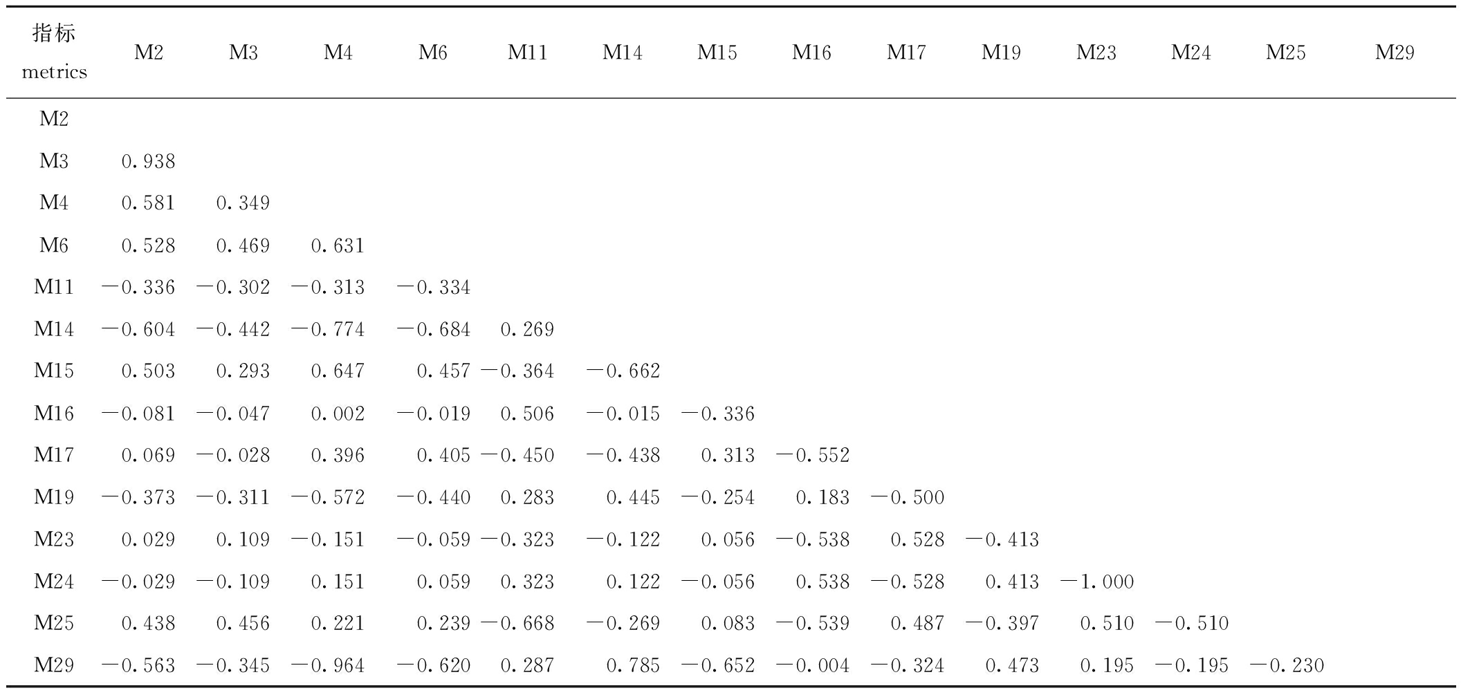 指标metricsM2M3M4M6M11M14M15M16M17M19M23M24M25M29M2M30.938 M40.581 0.349 M60.528 0.469 0.631 M11-0.336 -0.302 -0.313 -0.334 M14-0.604 -0.442 -0.774 -0.684 0.269 M150.503 0.293 0.647 0.457 -0.364 -0.662 M16-0.081 -0.047 0.002 -0.019 0.506 -0.015 -0.336 M170.069 -0.028 0.396 0.405 -0.450 -0.438 0.313 -0.552 M19-0.373 -0.311 -0.572 -0.440 0.283 0.445 -0.254 0.183 -0.500 M230.029 0.109 -0.151 -0.059 -0.323 -0.122 0.056 -0.538 0.528 -0.413 M24-0.029 -0.109 0.151 0.059 0.323 0.122 -0.056 0.538 -0.528 0.413 -1.000 M250.438 0.456 0.221 0.239 -0.668 -0.269 0.083 -0.539 0.487 -0.397 0.510 -0.510 M29-0.563 -0.345 -0.964 -0.620 0.287 0.785 -0.652 -0.004 -0.324 0.473 0.195 -0.195 -0.230