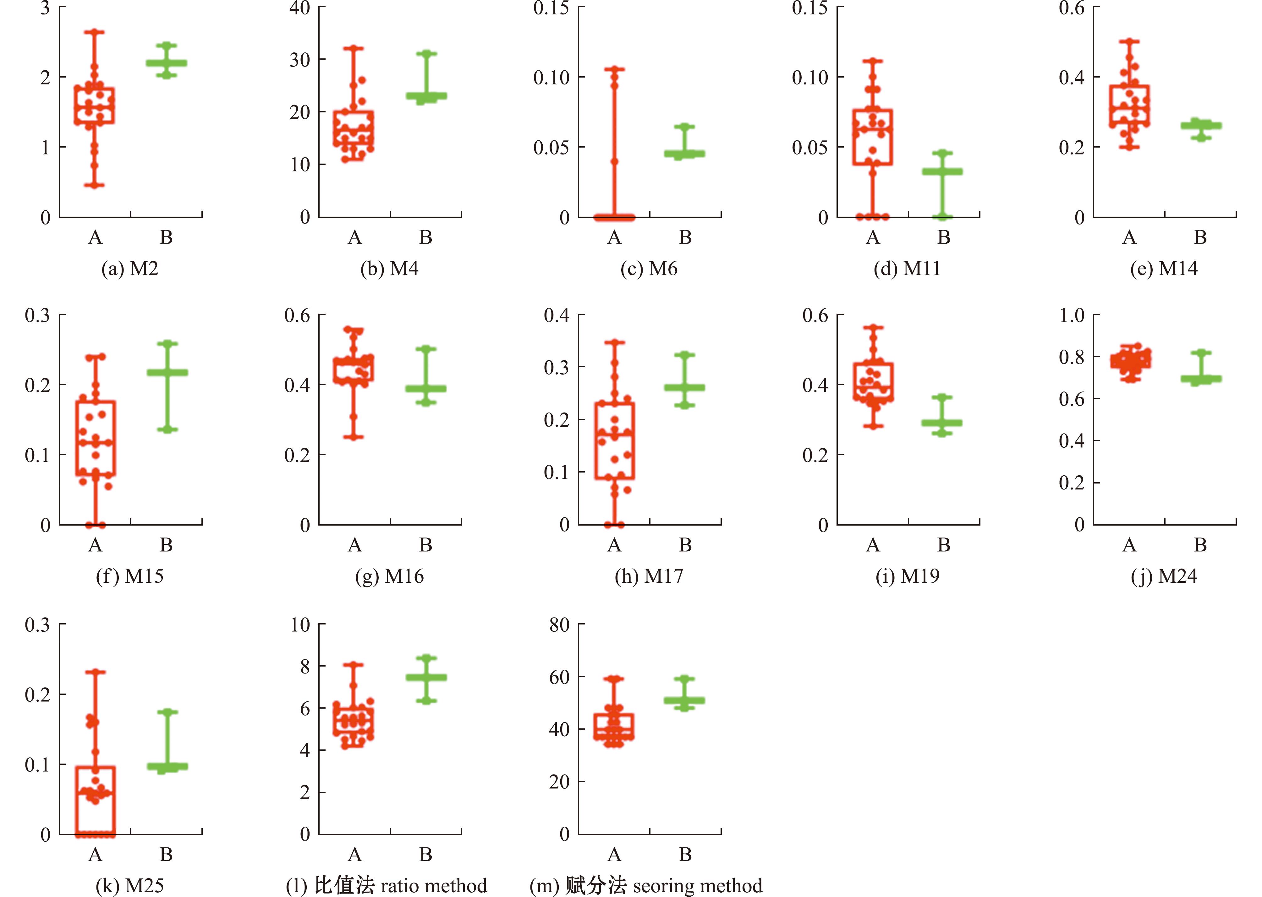 (a)~(k)—核心指标;(l)~(m)为赋值方法;A—受损点;B—参照点。