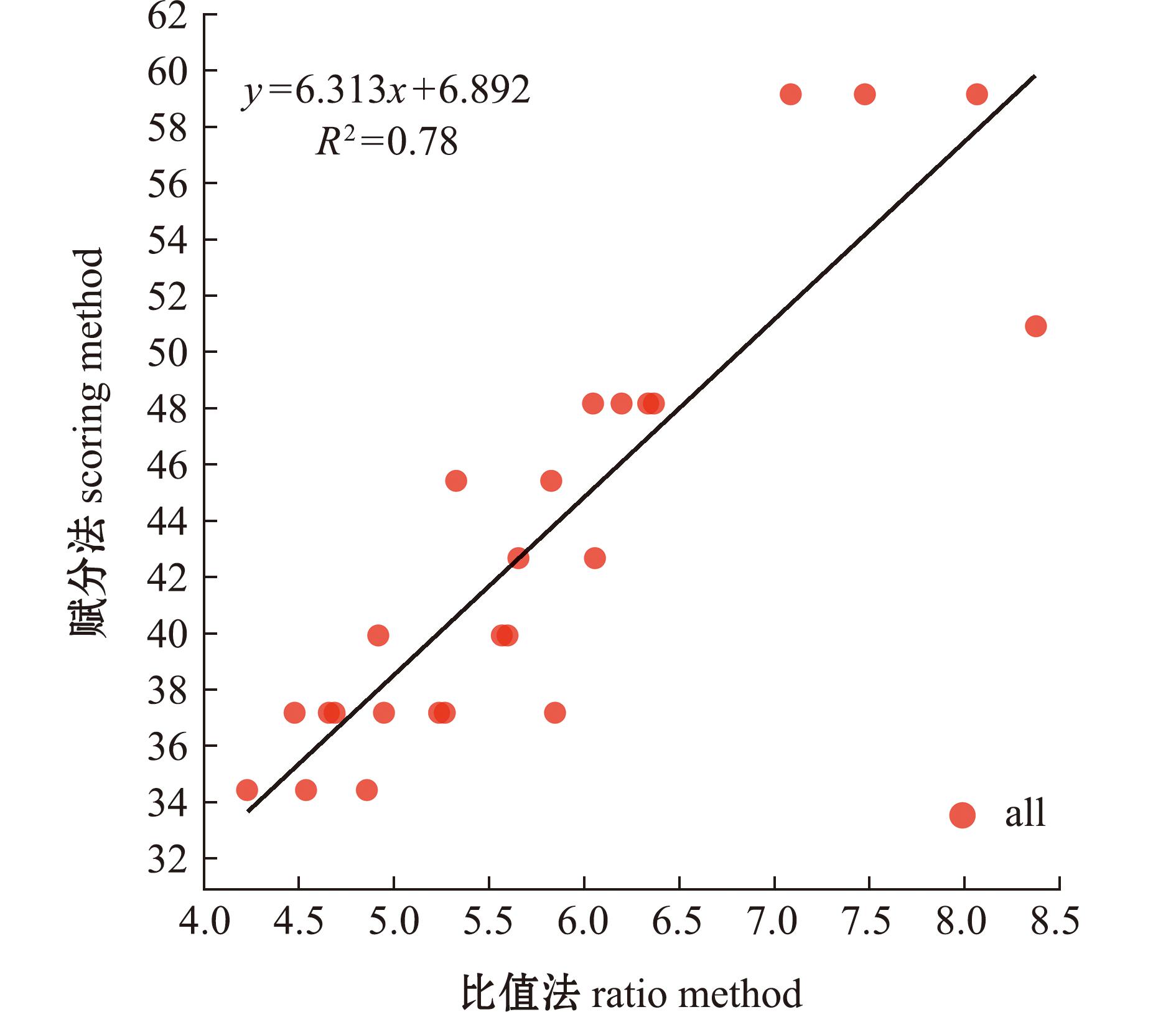 Fig.3 Correlation analysis of assessment outcomes by using the ratio method and the point-based scoring method