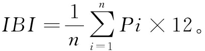 1.2.7 赋值指标及评价标准 选用比值法和1、3、5赋分法对核心指标进行标准化。其中,比值法对受到干扰越强、分值越低的指标,按式(3)进行标准化赋分;对于受到干扰越强、分值越高的指标,按式(4)进行标准化赋分。赋分法将每个指标分为3等分,最差的等级记为1分、中间的等级记为3分,最好的等级记为5分;为了避免指标个数引起IBI总分值的不同,按式(5)换算IBI总分。