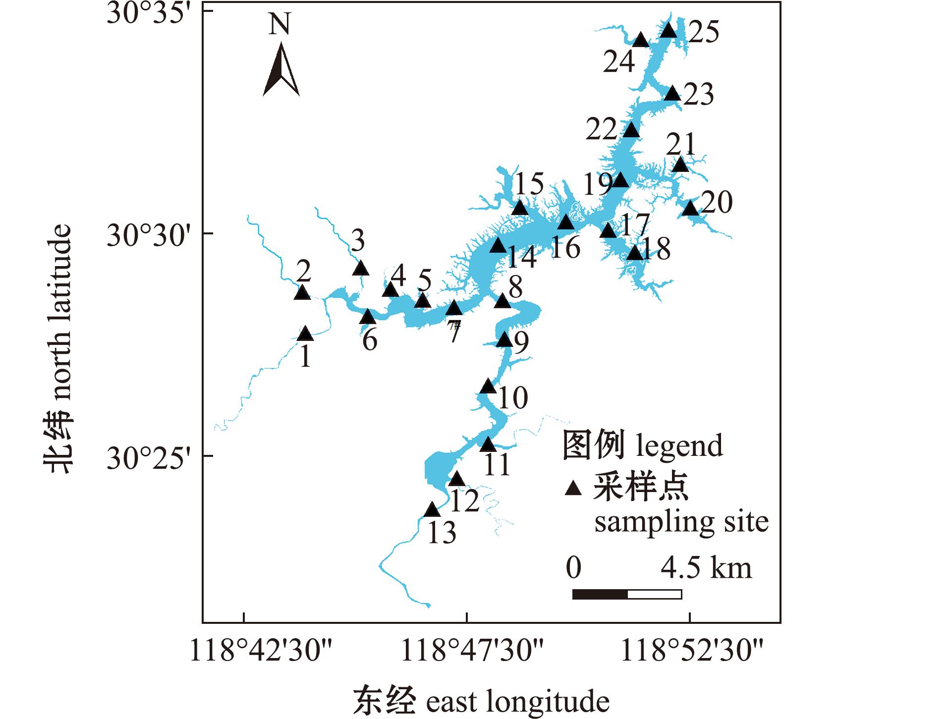 根据青龙湾水库形态和水文等特点,在水库设置25个断面,在每个断面设置3个采样点,采样点覆盖了水库库区及其支流,分别于2023年6月、8月、11月和2024年1月开展鱼类eDNA样品采集(图1)。