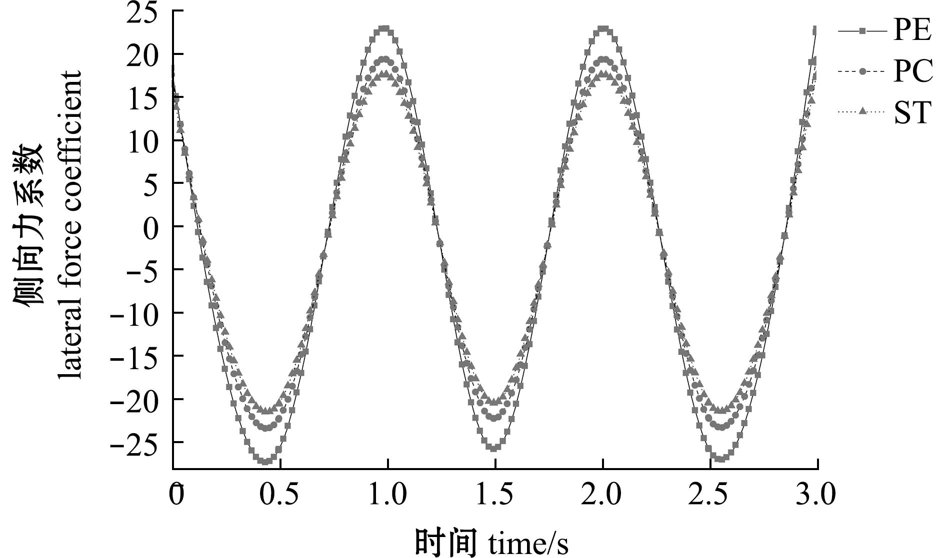不同材料的大黄鱼尾鳍在侧向力上也呈现出PE材料>PC材料>ST材料的现象(图13)。在水流速度为0.5 m/s时,运动频率为1.0 Hz,摆角幅度为30°条件下变厚度PE材料大黄鱼尾鳍模型的侧向力系数范围为-25.856 2~24.327 77;变厚度PC材料大黄鱼尾鳍模型的侧向力系数范围为-21.929~20.782 62;变厚度ST材料大黄鱼尾鳍模型的侧向力系数范围为-20.016 30~18.997 31。