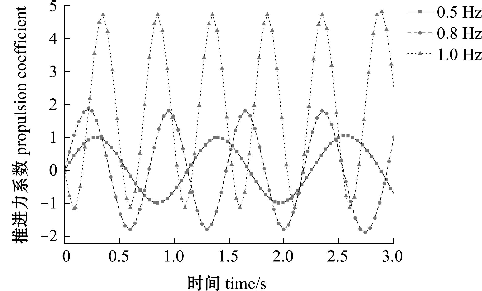 不同运动频率的水动力试验,基于不同摆角幅度的水动力试验结果,设置水流速度v=0.5 m/s,模拟仿真了大黄鱼尾鳍在运动频率为0.5、0.8、1.0 Hz的推进力系数和侧向力系数。