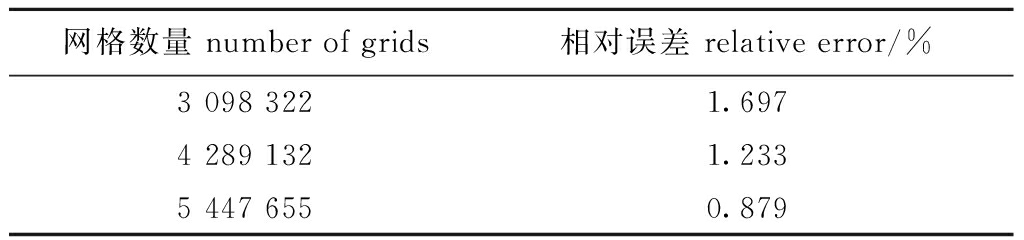 网格整体缩放比例为0.4,网格数量为2 074 298。通过划分不同数量网格对比相对误差来验证网格无关性(表1)。