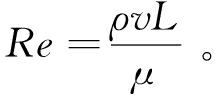 式中:ρ为流体密度(kg/m3),水的密度ρ=998 kg/m3;v为流速(m/s);L为特征长度(mm),L=62.4 mm;μ为水的动力黏度(Pa/s),μ=0.001 Pa/s。