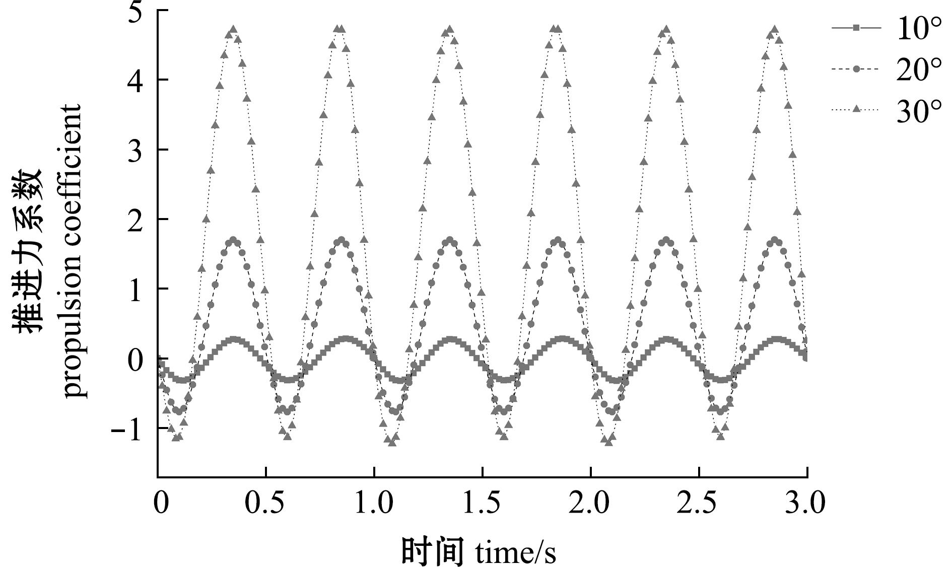 不同摆角幅度的水动力试验,基于大黄鱼尾鳍三维模型,设置水流速度v=0.5 m/s,尾鳍的运动频率f=1.0 Hz,模拟仿真了大黄鱼尾鳍在摆角幅度为10°、20°、30°的推进力系数和侧向力系数。
