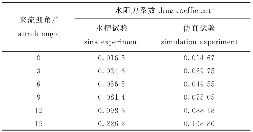 来流迎角/°attack angle水阻力系数 drag coefficient水槽试验sink experiment仿真试验simulation experiment00.016 30.014 6730.034 60.029 7560.056 50.049 5590.081 40.075 05120.098 30.088 18150.226 20.198 80