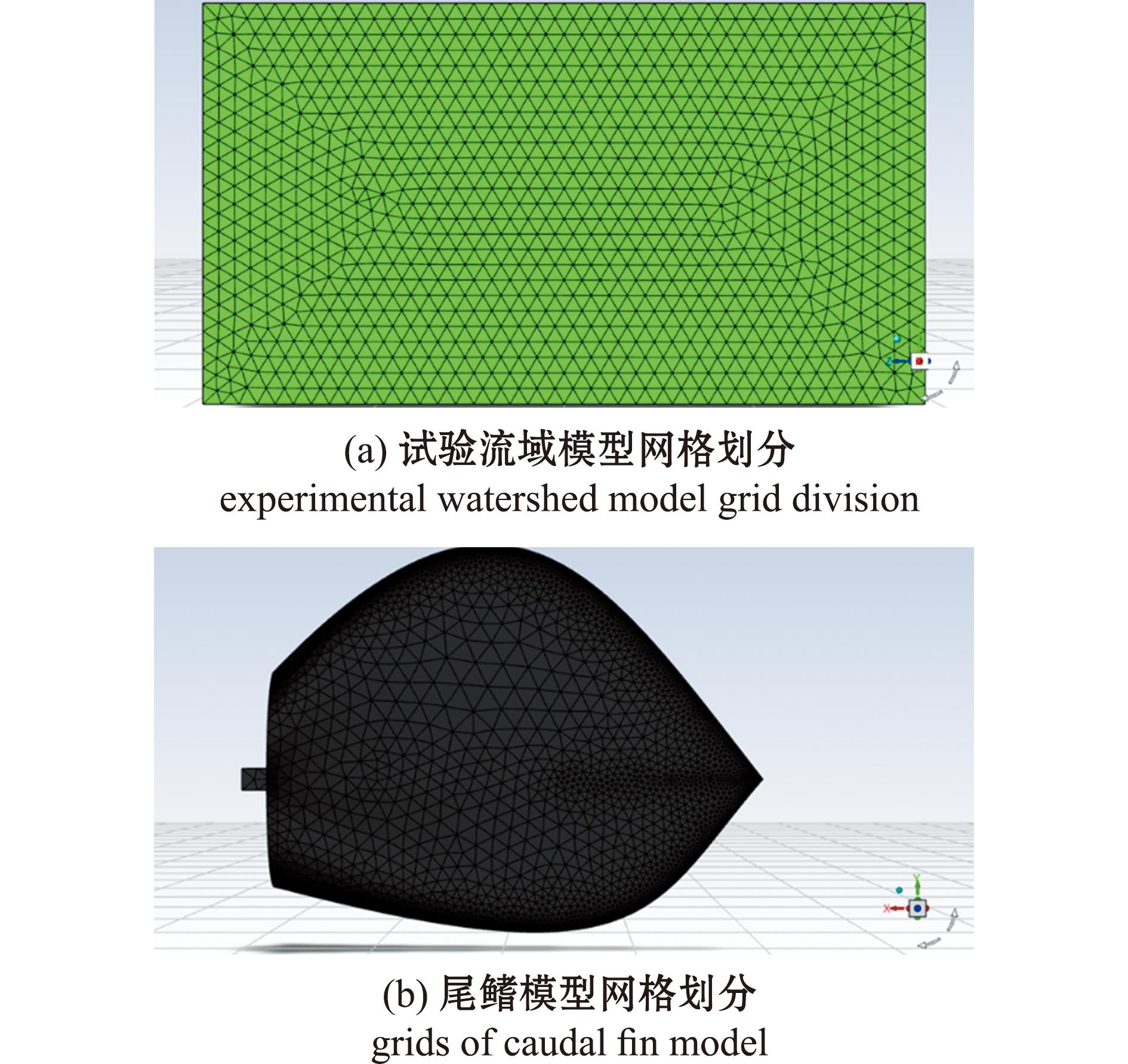 1.2.2 试验网格划分 试验模型中流体计算域的网格划分使用Fluent 2023 R1中的ICEM-CFD,网格划分方法为混合网格划分,流体计算域采用结构化网格划分方法,尾鳍模型采用非结构化网格划分方法[21]。大黄鱼尾鳍模型由封闭曲线构成,因此鱼体模型内部无需进行网格划分[8]。同时,为保证计算正确性和精度,在尾鳍模型加入膨胀层,膨胀层层数为10,增长比为1.1[22]。为了避免外流场的边界效应,将流体计算域模型的边界单元尺寸设置为0.002,大黄鱼尾鳍模型的边界单元尺寸设置为0.001(图5)。