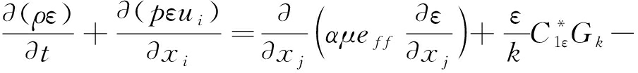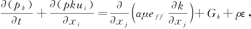 式中:μt为湍动黏度;ε为湍流耗散度;k为湍流动能;ρ为流体密度;Gk为平均速度梯度引起的湍流动能k的产生项;C1ε和C2ε为经验系数。
