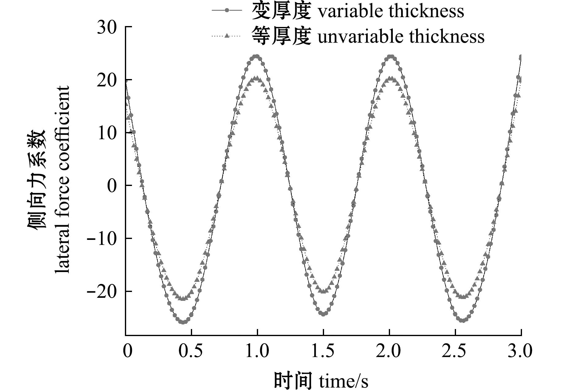 不同厚度的大黄鱼尾鳍在侧向力上也呈现出变厚度尾鳍略优于等厚度尾鳍的现象(图11)。在水流速度为0.5 m/s时,运动频率为1.0 Hz,摆角幅度为30°条件下变厚度大黄鱼尾鳍模型的侧向力系数范围为-25.856 2~24.327 77;等厚度大黄鱼尾鳍模型的侧向力系数范围为-21.306 3~20.131 62。
