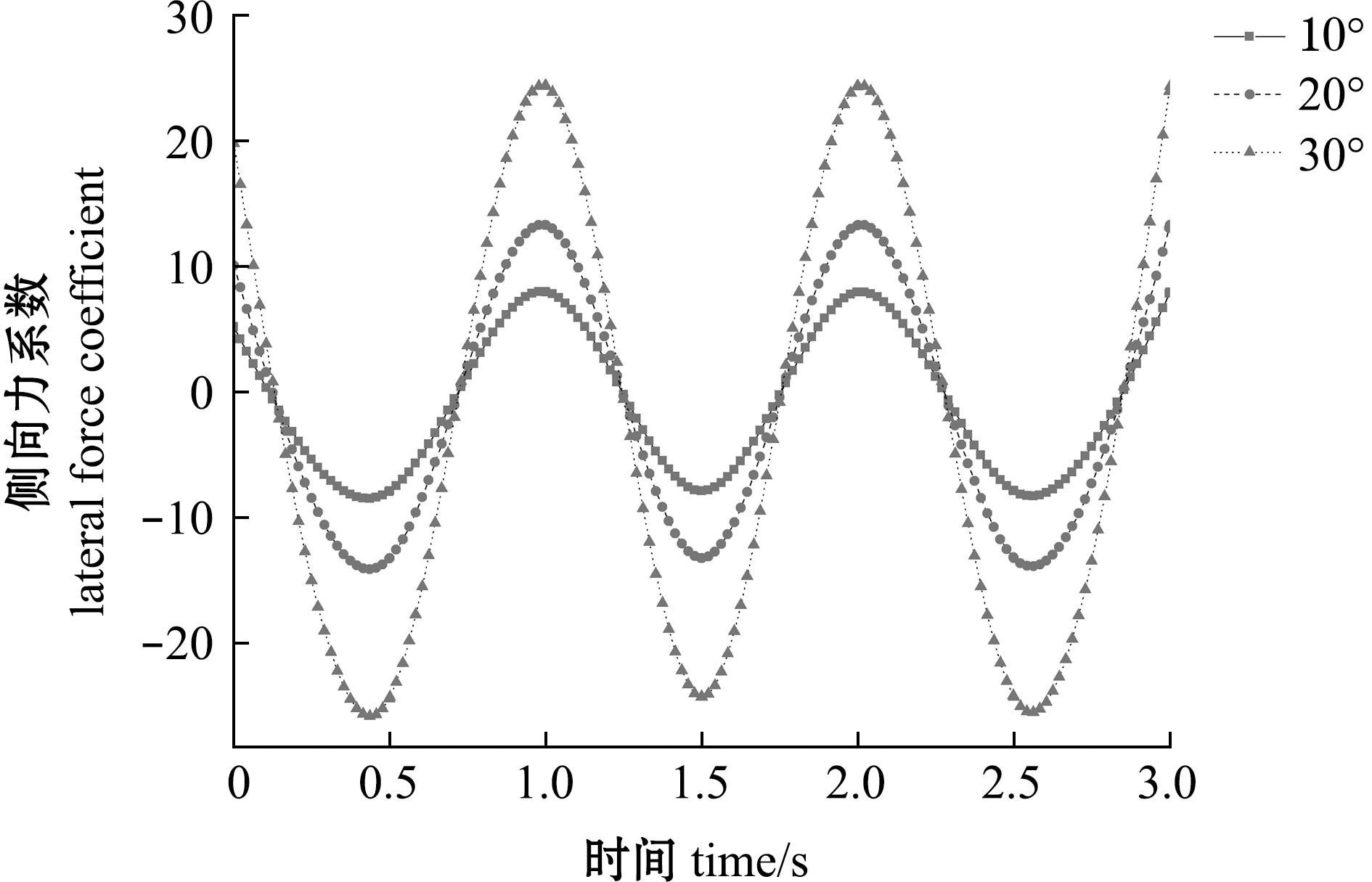 不同摆角幅度的大黄鱼尾鳍模型侧向力系数也呈现出一种正摆角幅度的趋势,即随着摆角幅度的增加,大黄鱼尾鳍在流域内的侧向力系数曲线波动峰值增加(图7)。在水流速度为0.5 m/s时,摆角幅度为10°的大黄鱼尾鳍模型侧向力系数范围为-7.928 11~7.928 11;摆角幅度为20°的大黄鱼尾鳍模型侧向力系数范围为-13.250 1~13.250 1;摆角幅度为30°的大黄鱼尾鳍模型侧向力系数范围为-24.327 8~24.327 8。结果表明,增加尾鳍摆角幅度,可有效增加尾鳍模型的侧向力。